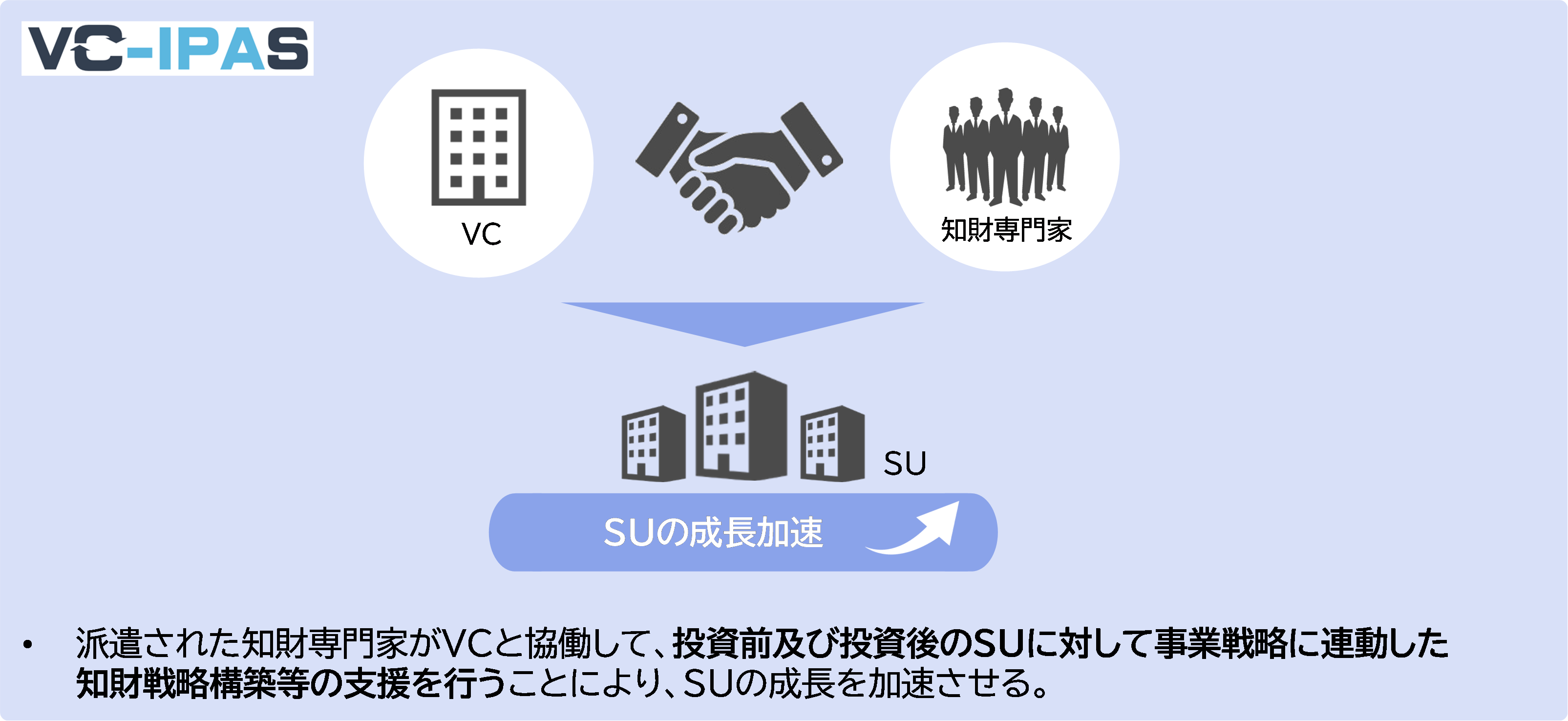 本プログラムでは、ベンチャーキャピタル(以下「VC」という。)へ弁理士・弁護士といった知財の専門家(以下「専門家」という。)を派遣し、VCを通じたスタートアップへの知財戦略構築等の支援を行うプログラムです。派遣された専門家がVCと協働して、投資前及び投資後のスタートアップに対して事業戦略に連動した知財戦略構築等の支援を行うことにより、スタートアップの成長を加速します。