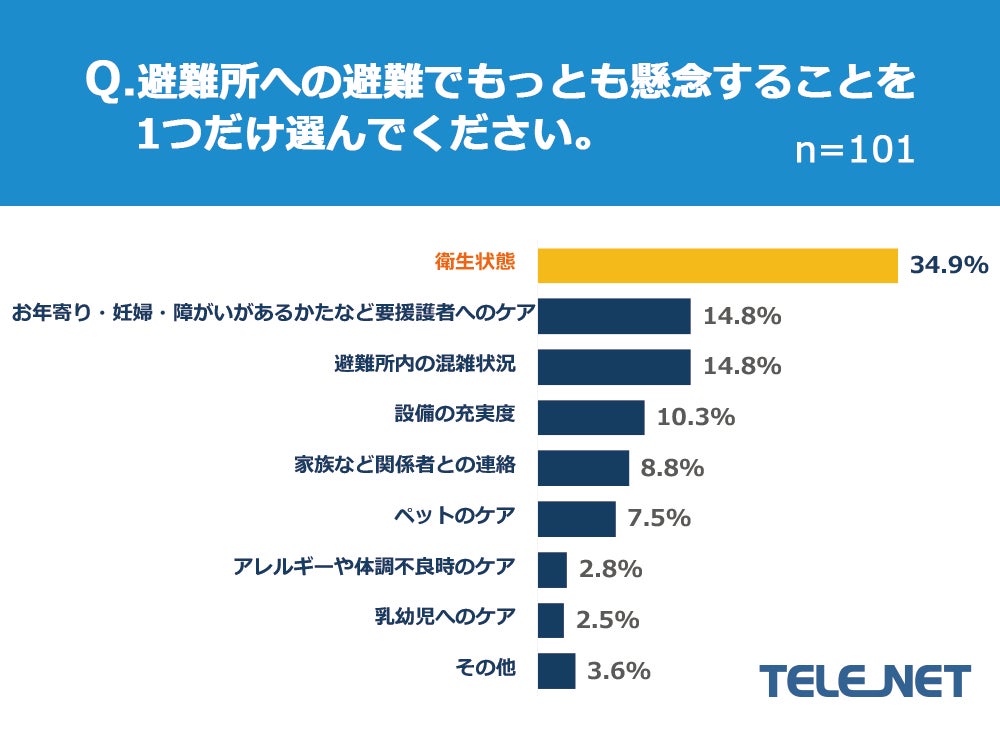 【避難所への避難、懸念点は?】34.9%が「衛生状態」と回答し、もっとも多い結果に災害時の避難所に関する調査テレネット株式会社