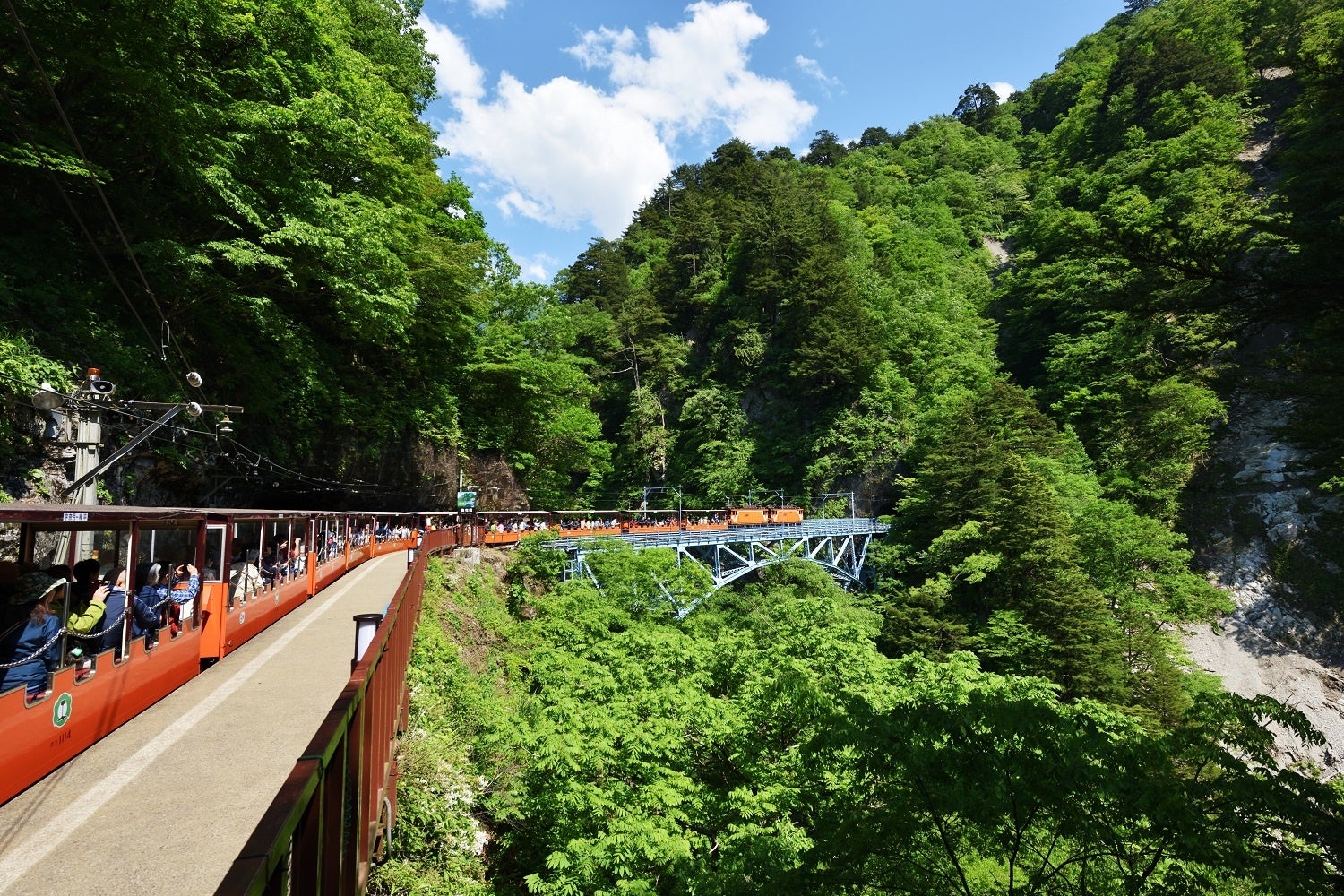 北陸新幹線 黒部宇奈月温泉駅で下車→徒歩(約1分)→富山地方鉄道 新黒部駅→(約25分)→宇奈月温泉駅で下車→徒歩(約5分)→黒部峡谷鉄道 宇奈月駅