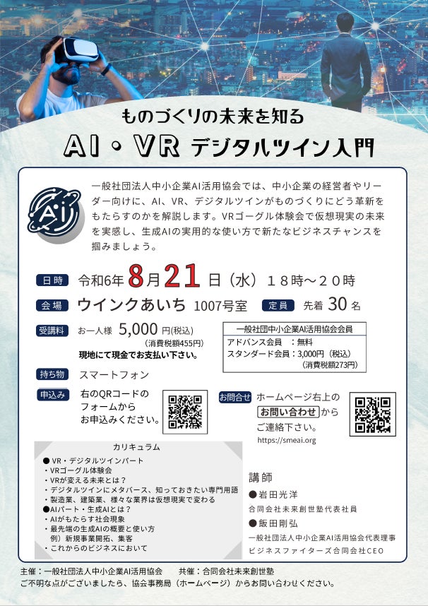 一般社団法人中小企業AI活用協会は、中小企業の経営者やリーダーの皆様を対象に、「ものづくりの未来を知る! AI、VR、デジタルツイン入門」セミナーを緊急開催いたします。AI、VR、デジタルツインといった先端技術が、製造業や建築業などの「ものづくり」にどのような革新をもたらすかを解説します。