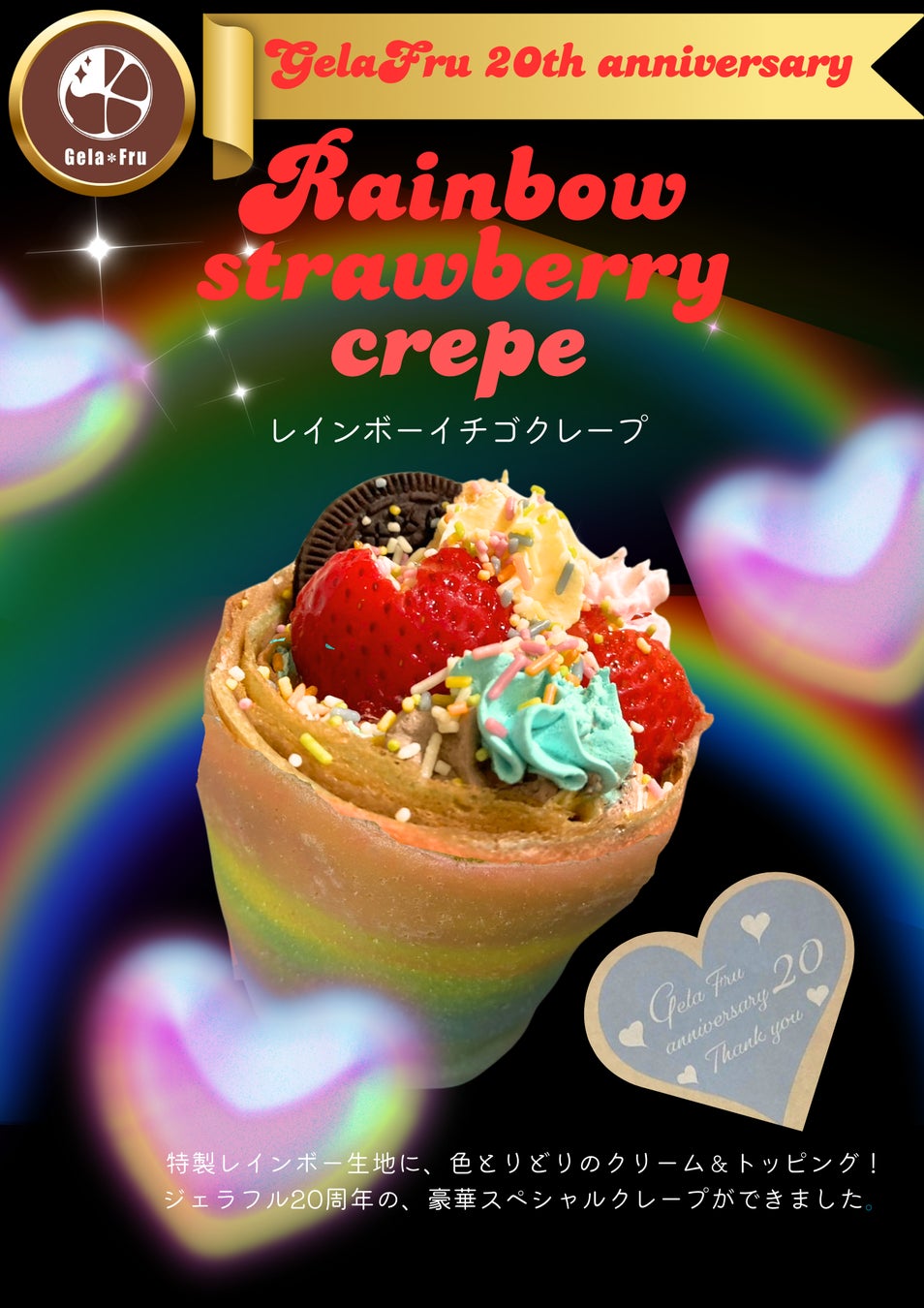 クレープ&タピオカ専門店ジェラフルでは、20周年の感謝の気持ちを込めまして、記念クレープ・「レインボーイチゴクレープ」を7月4日より発売いたします。