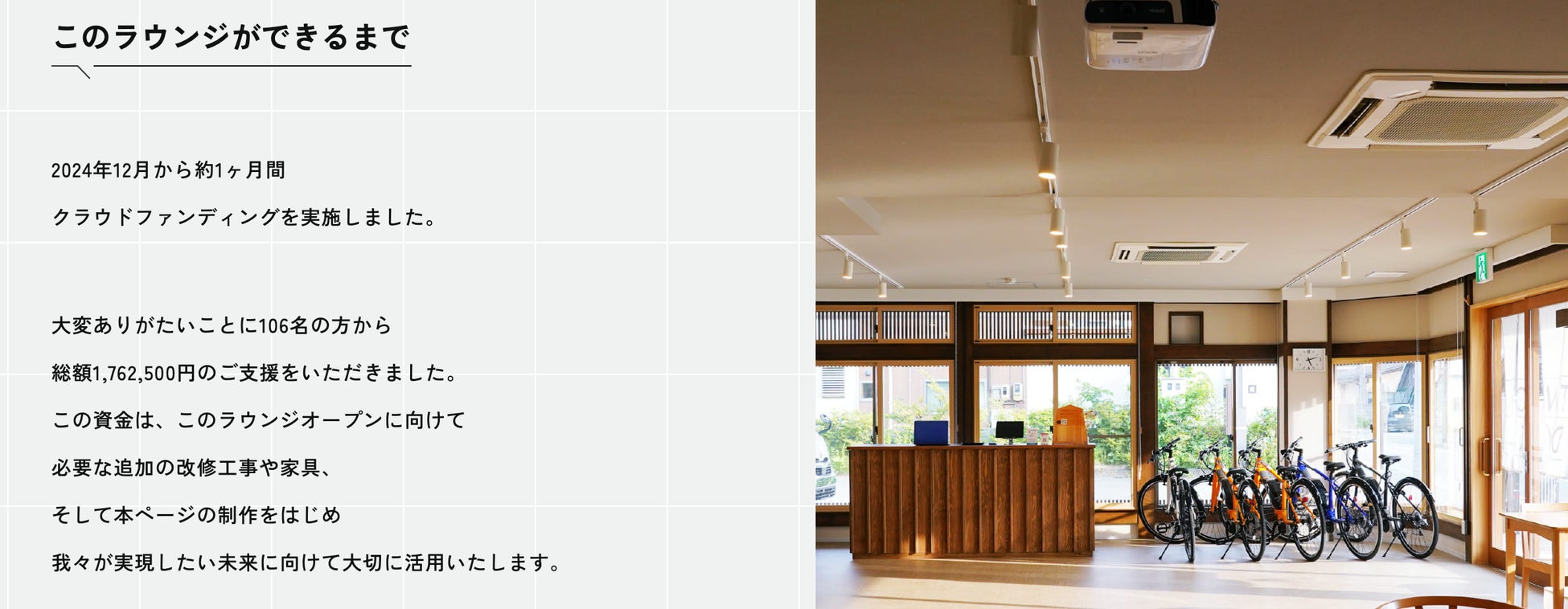 このトラベラーズラウンジを開設するにあたり、昨年12月から約1ヶ月間クラウドファンディングを実施しました。目標金額に対して117%の達成。多くの方に応援して支えていただき、このラウンジは完成しました。本当に多くの方に支えられオープンすることができました。