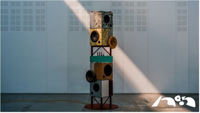 乃村工藝社グループが進める素材=地球資源をテーマとしたR&Dプロジェクト。大量の資源を消費する建築・内装業界において、素材を起点に様々なサステナブルな研究・開発を行っている。「noon by material record」は、建築廃材、食品廃棄、自然素材などのサステナブル・マテリアルでスピーカーを制作し、音響体験を通して素材の新しい価値観を生み出すことにチャレンジしている。