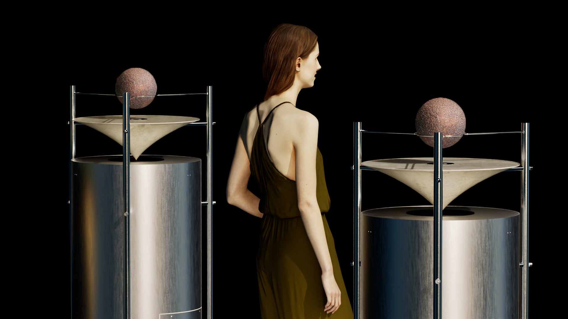 鉄・銅・アルミなど地球の元素である無機質な金属を一度完全に溶かし、有機的な形に再構築することで、素材の記憶を表現。宙に浮かぶ架空の鉱物を想起させ、ロケットが夢見たロマンを描いています。