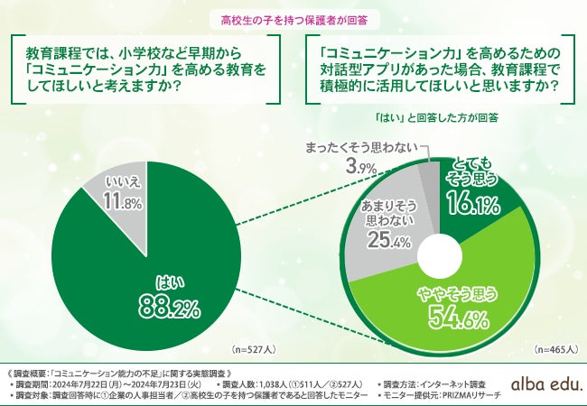 今回、一般社団法人アルバ・エデュ(https://www.alba-edu.org/)は、①企業の人事担当者/②高校生の子を持つ保護者を対象に、「コミュニケーション力」に関する実態調査を実施しました。