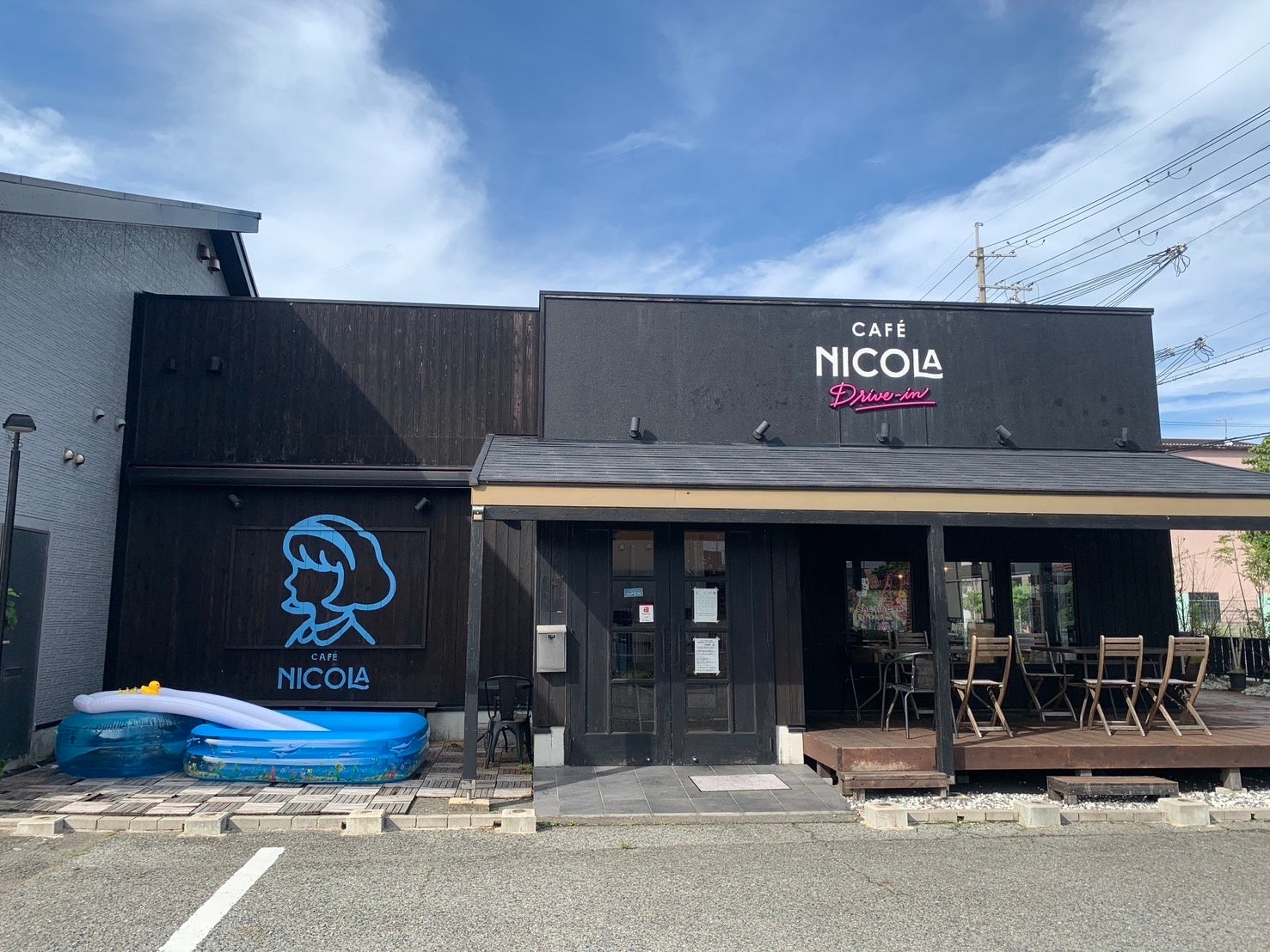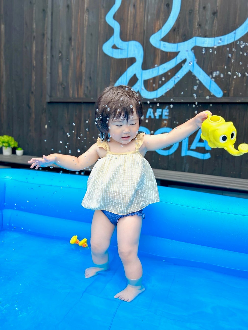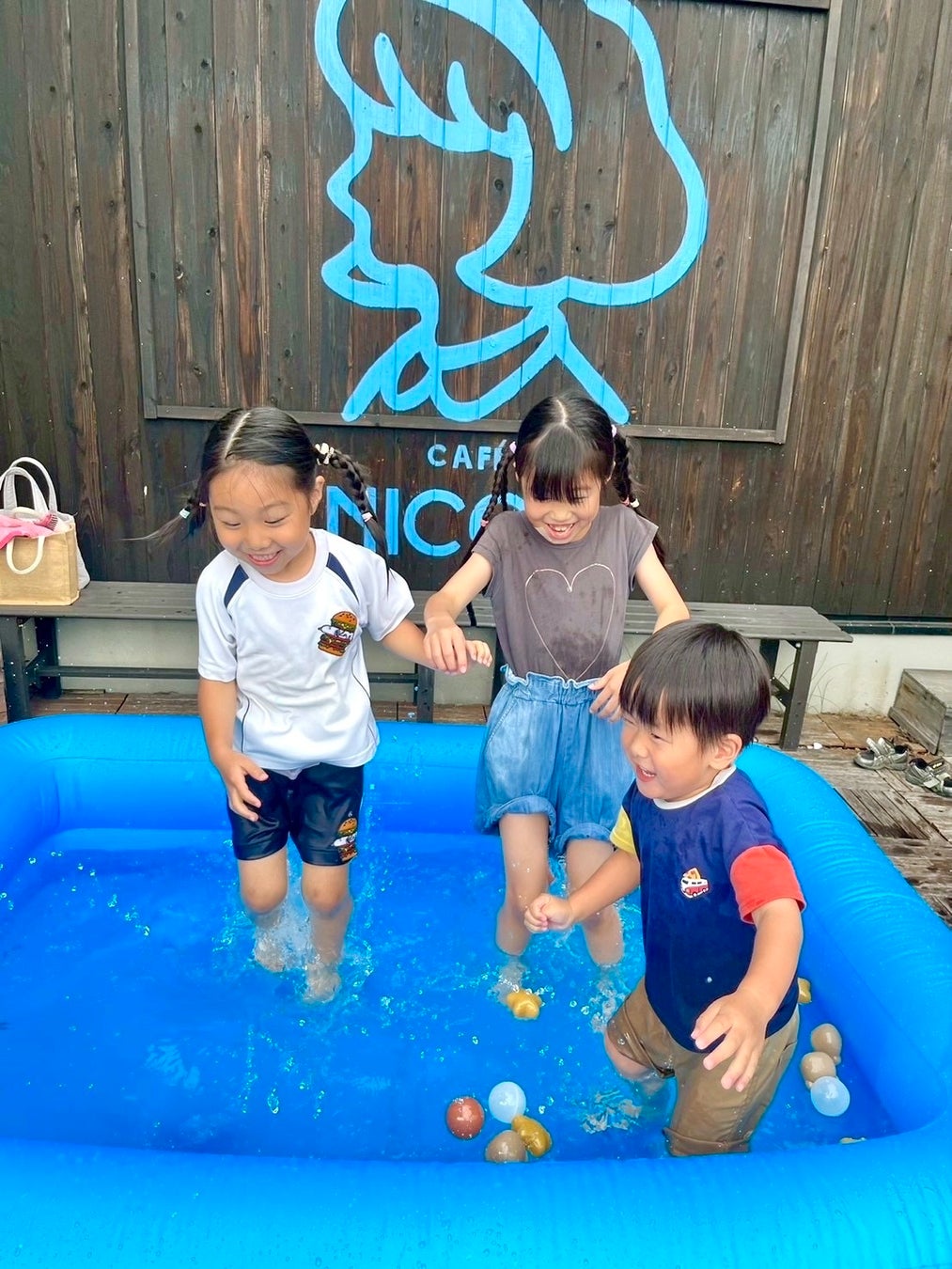 CAFE NICOLAでは、初めての水遊びや遠方に行くことが困難なユーザー様に、気軽に近場で楽しんでいただけるよう滑り台付きミニプールや水遊び用のおもちゃを設置しております。