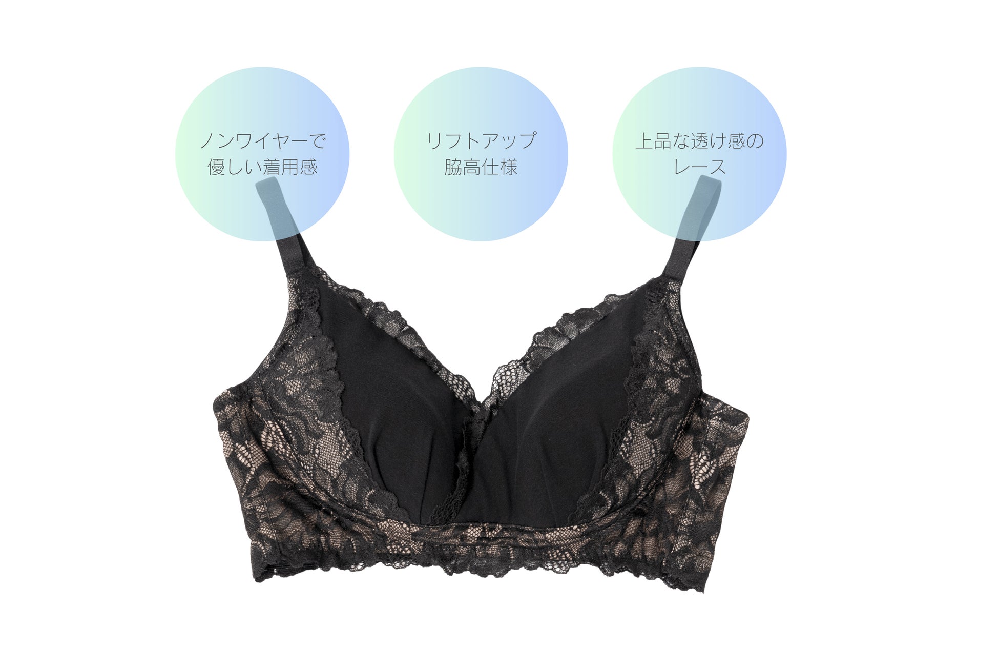 脇高リフトアップ仕様のノンワイヤーブラ。