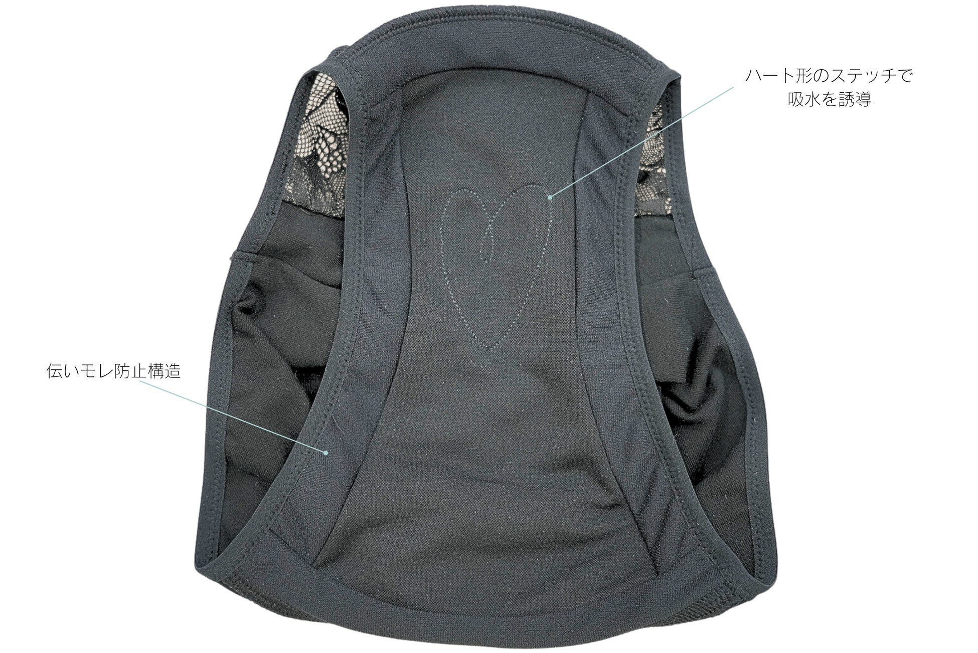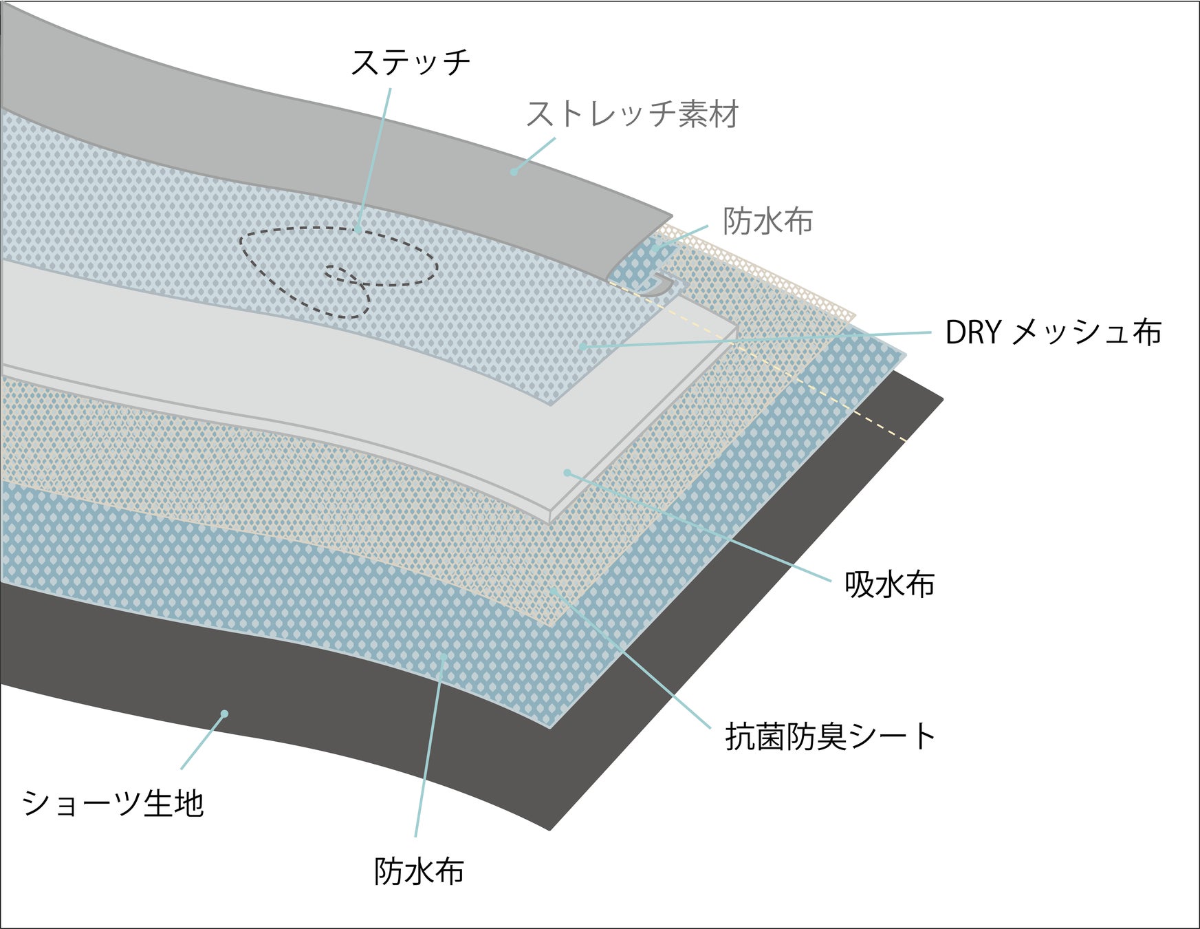 周囲はストレッチ素材と防水布の二重構造で、伝いモレを防止。水分が漏れないような仕様構造になっています。