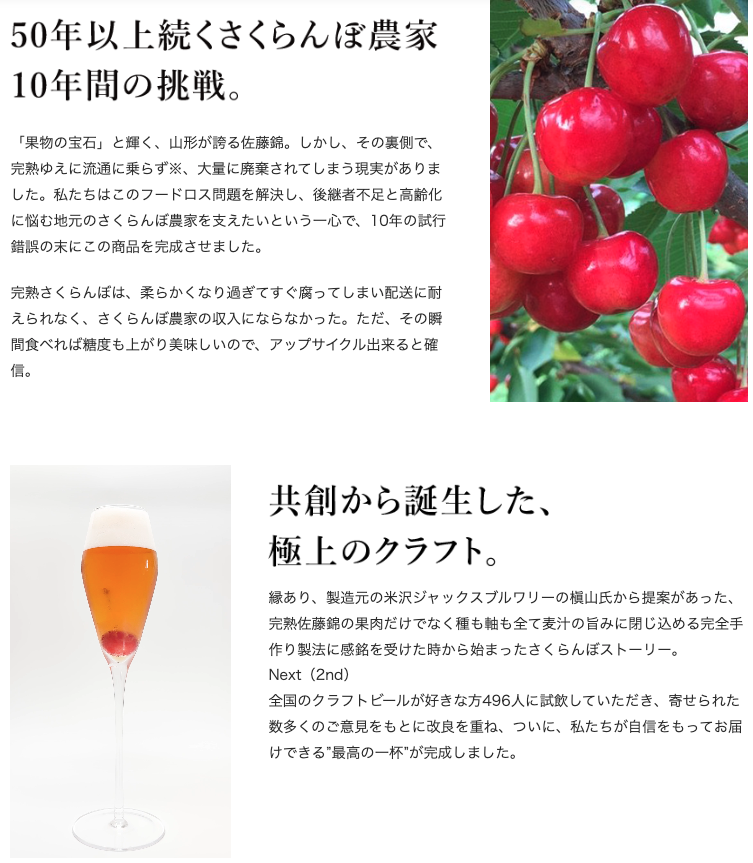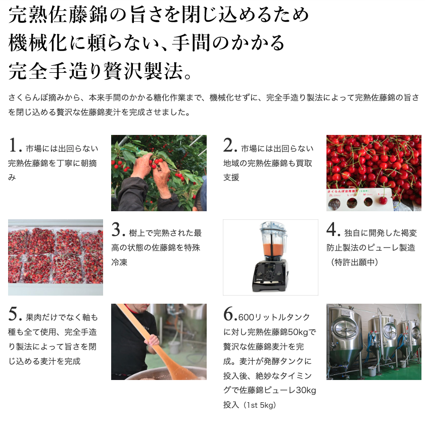 今回のセカンドロットでは、麦汁のベースとなる完熟佐藤錦50kgはそのままに、この特許出願中の独自ピューレを、前回の6倍となる30kgへと大幅に増量。ホップの華やかな香りと苦味に決して負けない、佐藤錦の瑞々しい果実味と芳醇な香りが口いっぱいに広がる、”究極のさくらんぼ感”を実現しました。