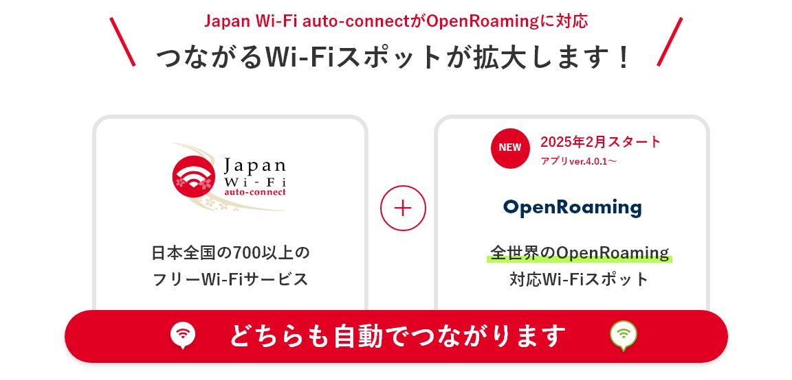 エヌ・ティ・ティ・ブロードバンドプラットフォーム株式会社(代表取締役社長:加藤成晴、以下「NTTBP」)は、2019年12月より、全国の自治体、公共交通機関、商業施設、観光拠点等で整備されているフリーWi-Fiに自動的につながるスマートフォン向けアプリケーション「Japan Wi-Fi auto-connect」を提供しておりますが、ご利用者さまにより一層便利にお使いいただけるよう、2025年2月27日(木)より、フリーWi-Fiの新たな認証の仕組みであるOpenRoamingに対応いたします。