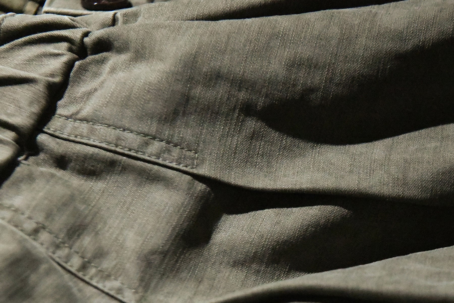 更に何度もテストを繰り返し、遠目にはアタリのように見えるギリギリまで洗いをかけてカモフラージュ柄のような雰囲気に。バックサテンという生地と合わせてミリタリーのフィーリングをブランドらしく表現しています。
