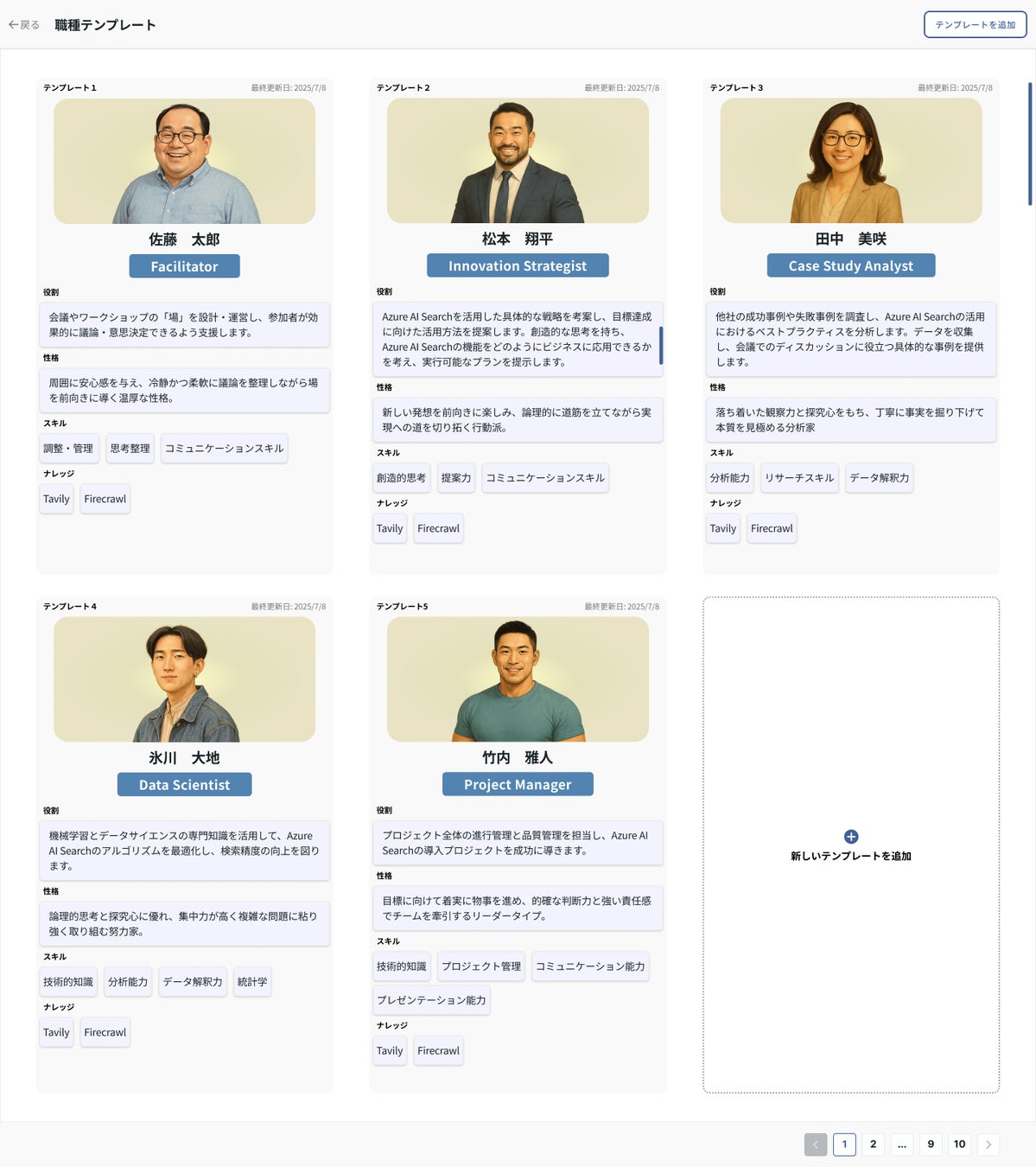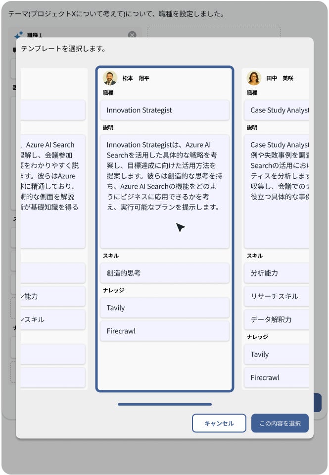 異なる専門性を持つ複数のAIエージェントが同席し、マーケティング・技術・経営など多様な視点でディスカッションを展開。単一の視点に偏らず、多角的な意思決定をサポートします。
