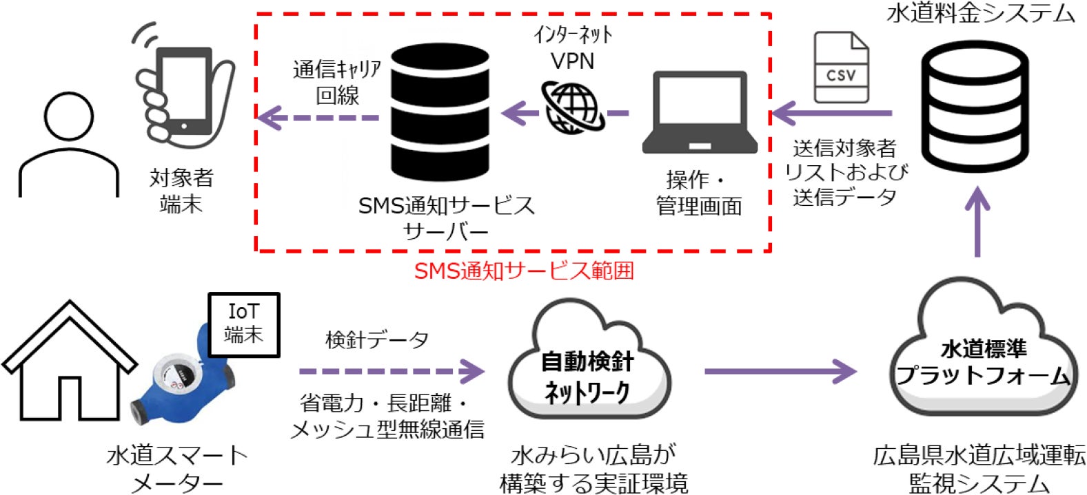 本実証は水道スマートメーターによる水道自動検針からSMSによる「検針のお知らせ」等の送付までを一体的に運用することを目指しています。また、水道自動検針データを水道標準プラットフォーム※により管理・活用する一連の実証は、中国地方初の取り組みとなります。