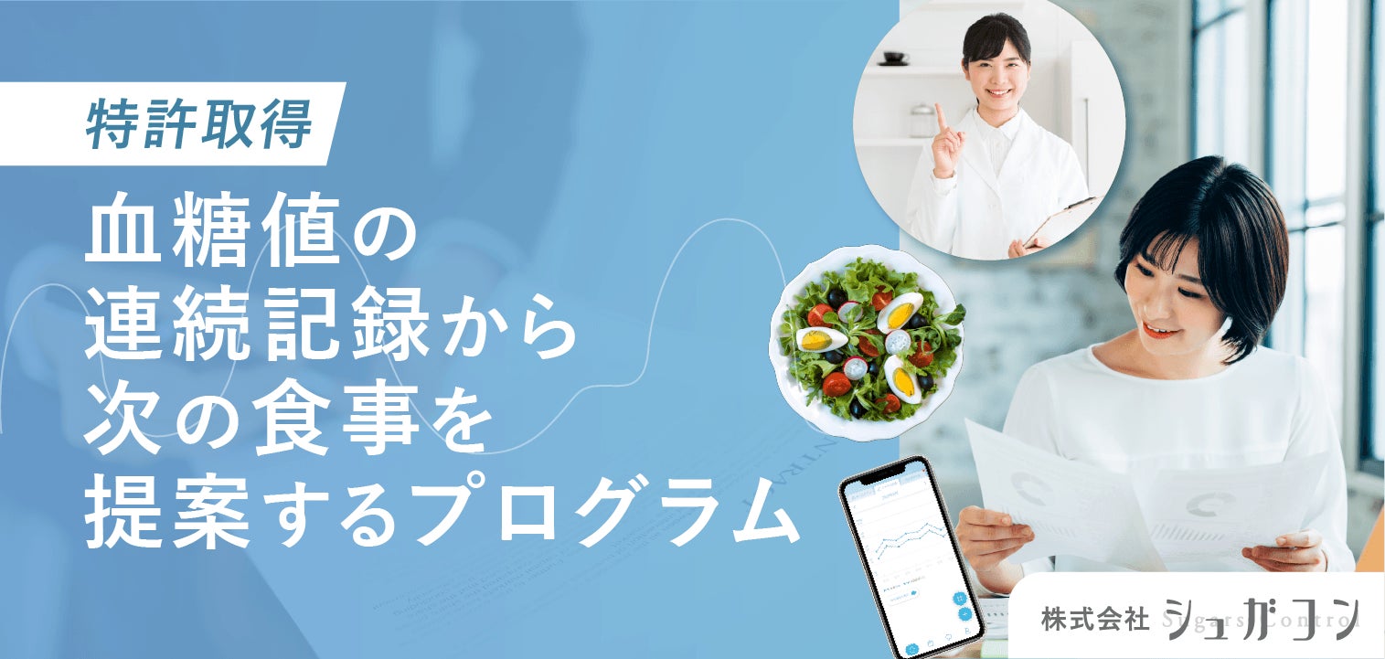 血糖値と食事の関連性を可視化し、パーソナルなフィードバックを返せる新しいサービス『シュガコン2weeks』を提供する株式会社シュガコン(本社:東京都港区、代表取締役:池ノ内佳苗、以下「シュガコン」)は、血糖値の連続記録に伴う食事の態様を決定するプログラムにおいてビジネスモデル特許を取得。これに伴い新規プログラム作成・サービスリリースしたことをお知らせいたします。