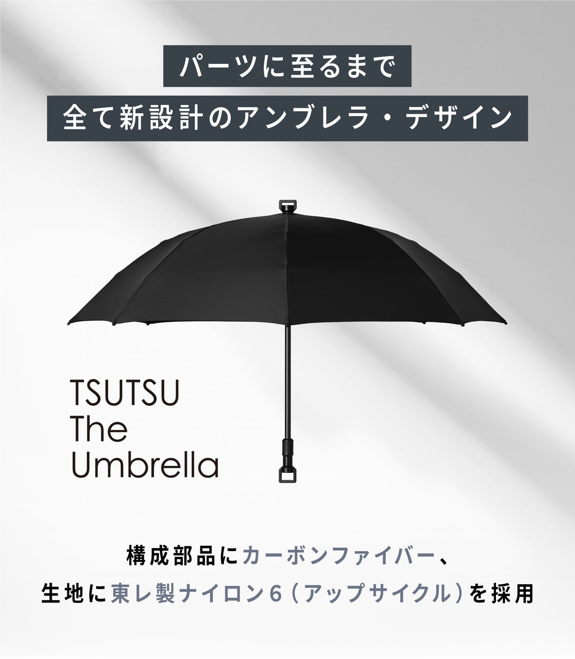 『TSUTSU The Umbrella 621』は、「折り畳み傘以上、長傘未満」サイズのオリジナルのデザインを開発し、軽量・高強度・高耐久であるカーボンファイバーを傘骨に採用しました。これにより、8本骨でありながら重量は約230g(※1)という軽さを実現しています。