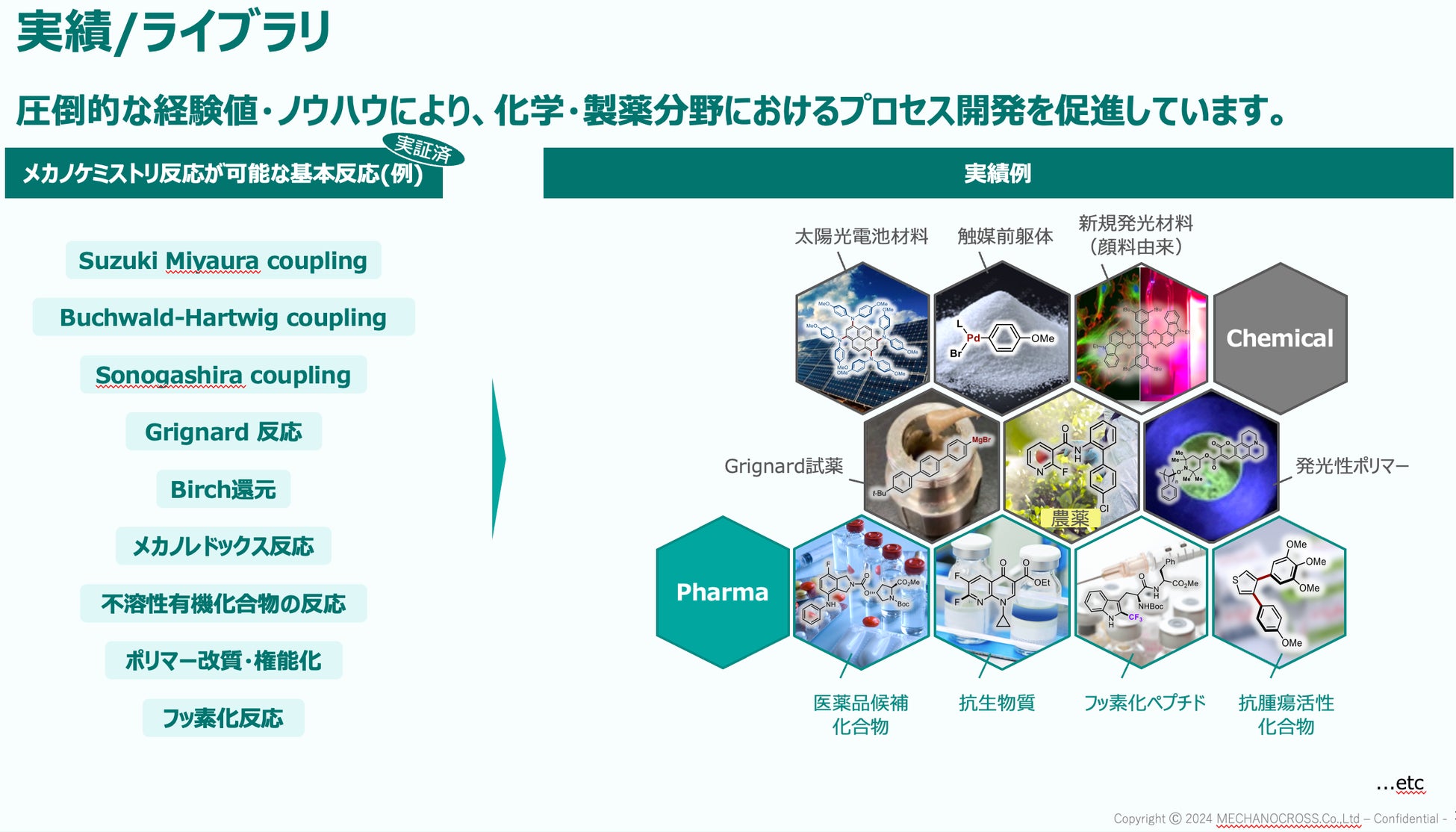 また、 有機合成反応の適応性の広さも特徴的で、 北海道⼤学⼯学研究院の伊藤研 (伊藤教授は、メカノクロスの取締役)では、多くの化学反応を実証してきました。
