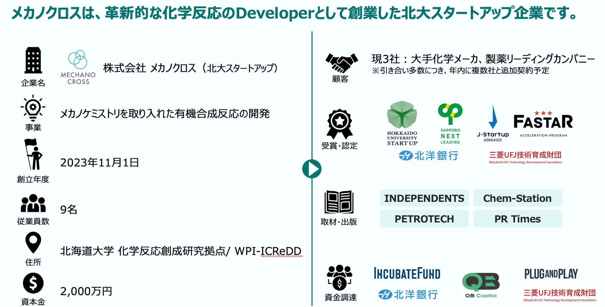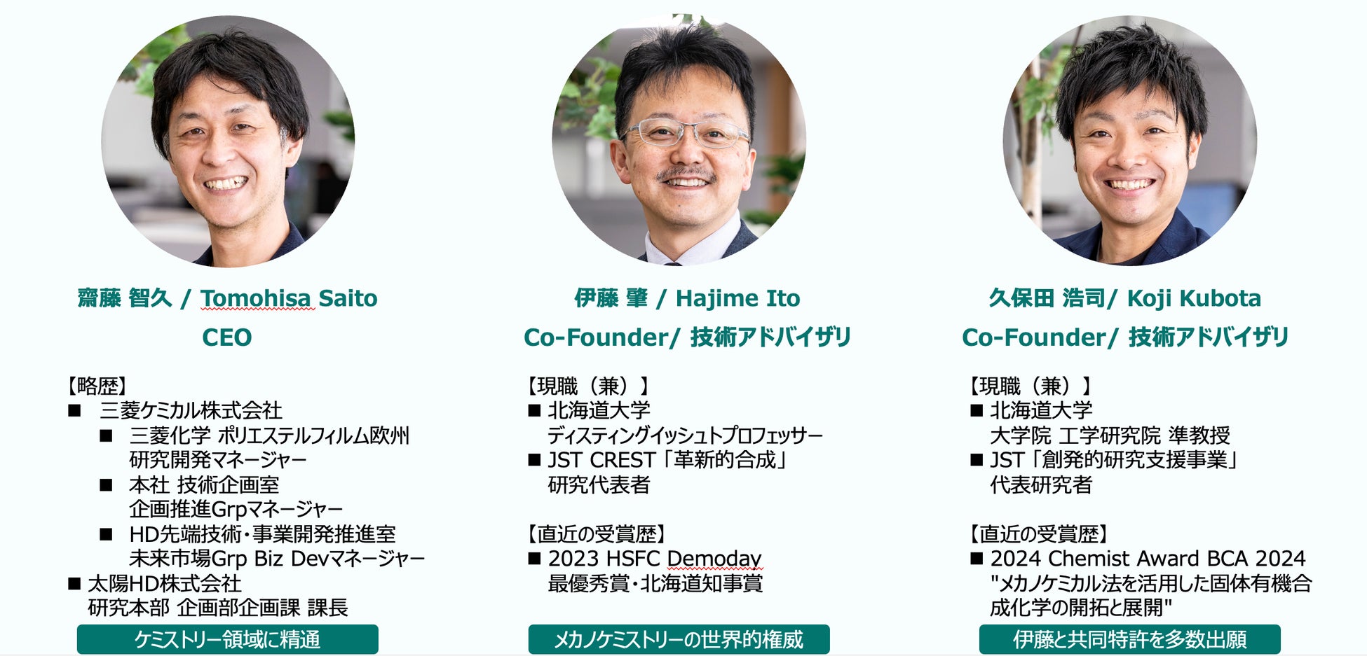 2018年から北海道⼤学の伊藤肇卓越教授、久保⽥浩司准教授が研究を始め、溶媒を使わずに有機合成できる技術について、5年かけて世界をリードする技術にまで押し上げました。伊藤教授の研究室の卒業生で、社会経験を積んだ卒業生である、齋藤と協力し、メカノクロスを2023年に設立しました。