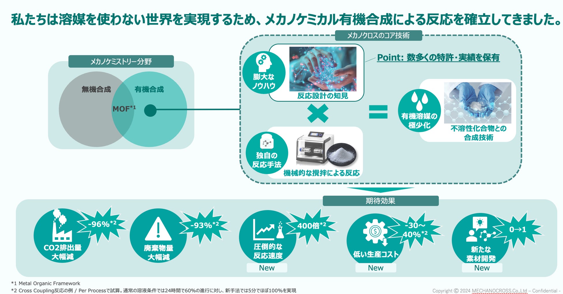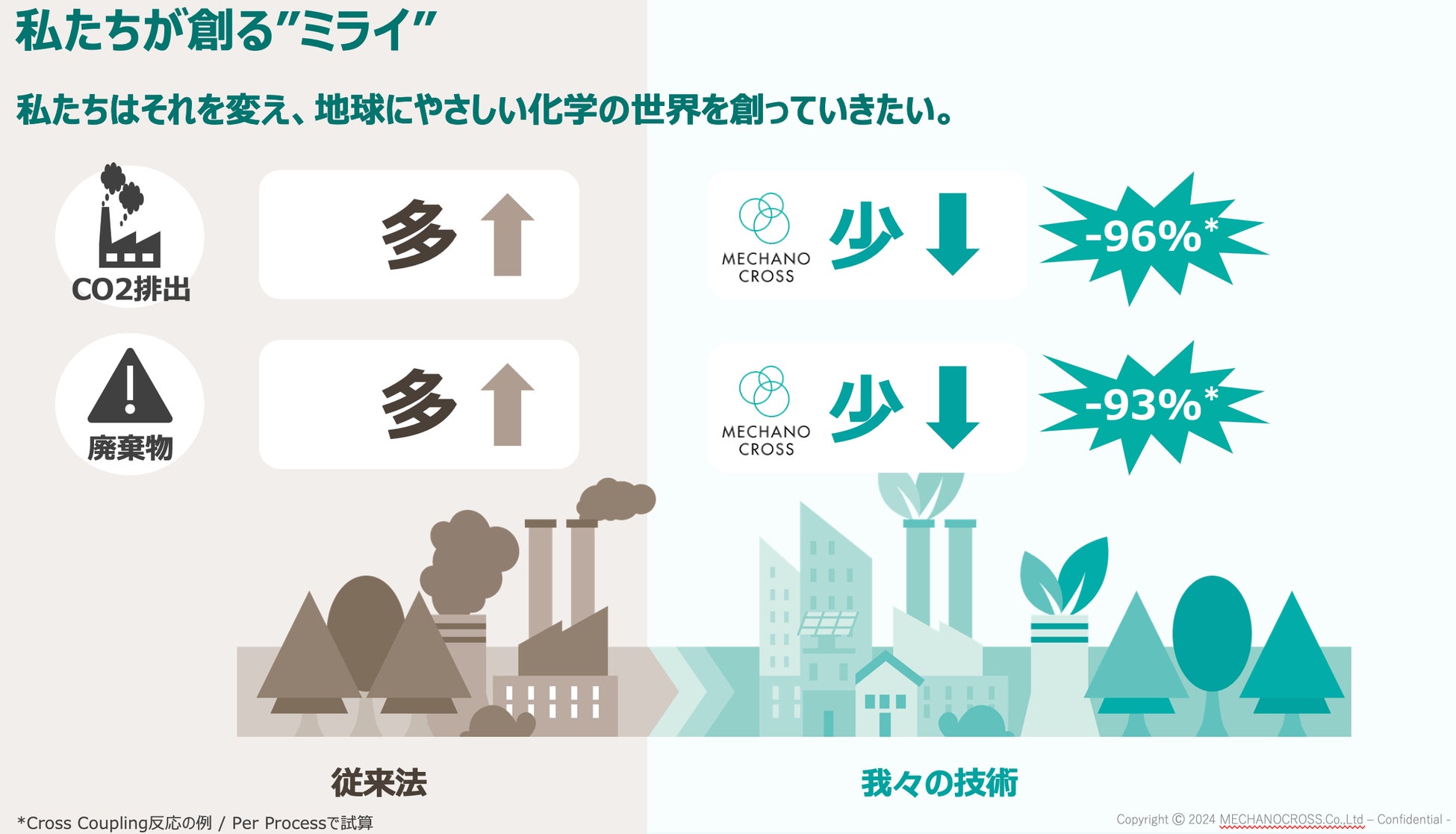 メカノクロスは現在、本技術を社会実装する⽬的で、2026年以降の本格的な市場参⼊に向け、国内外の製薬、化学メーカーなどと協⼒してメカノケミカル有機合成プロセスの導⼊実証を進めているところです。溶媒を極少量まで減らせ、反応性が⾼いことから、脱炭素対策向けや⼤幅なコスト削減向けを始めとして既存のプロセスよりも優位なデータを出せており、化学合成を⽤いるメーカーなどから積極的な引き合いを頂いております。また、溶媒を使⽤しないことから、現在までに難しいとされていた不溶性化合物の合成も可能となり、半導体、ディスプレイ、電池材料のさらなる性能アップに寄与していきます。