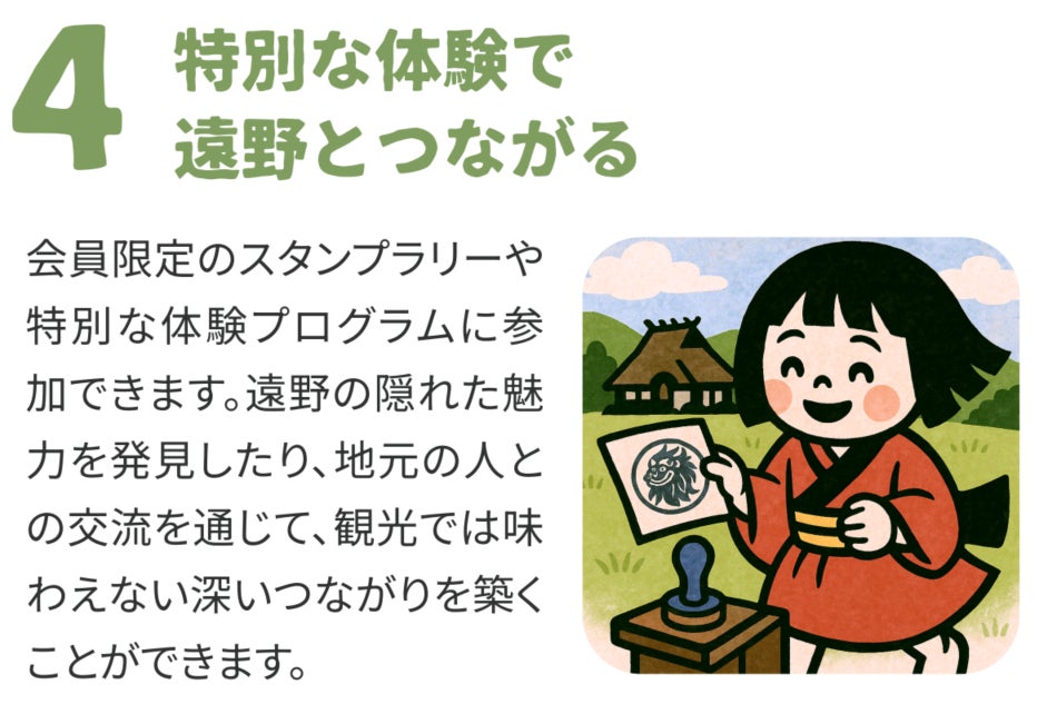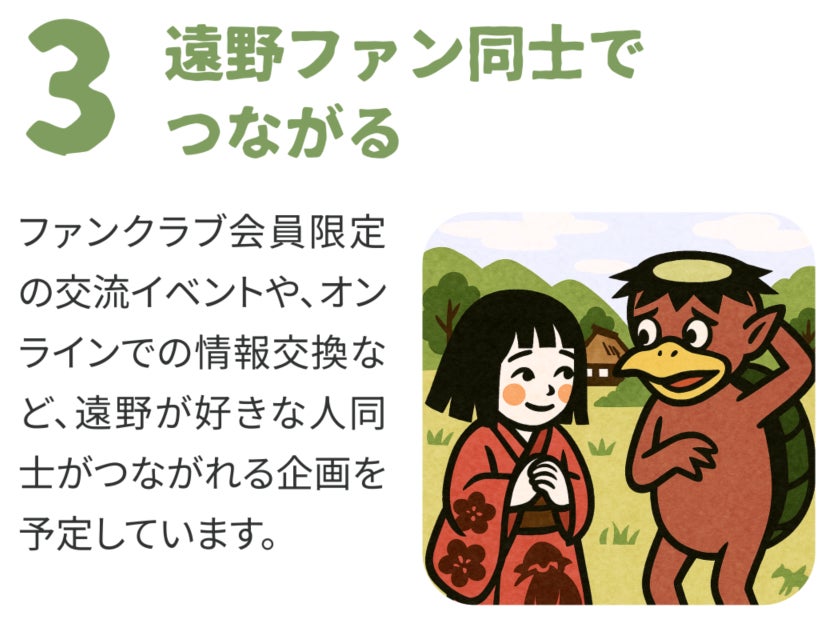 岩手県遠野市では、遠野が大好きな人、応援したい人、もっと楽しみたい人のためのファンクラブ、「遠野ファンクラブ」制度の運用を開始いたします。ユーザー様の遠野への理解を深め、地域とのつながりを強化するため、デジタル会員証を通じて特典やイベント情報をお届けする仕組みです。(主宰:遠野市役所産業部観光交流課、事業受託社:株式会社遠野ふるさと商社)。
