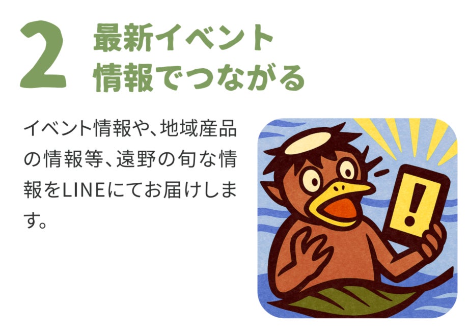 遠野ファンクラブは、LINE公式アカウントを活用して運営します。入会していただいた方には、LINE公式アカウントよりデジタル会員証を交付し、遠野にいても、離れていても、遠野とつながり、遠野のことをもっと知っていただくため、遠野で使える特典や最新のイベント情報など、遠野を“もっと近くに感じられる”コンテンツをお届けします。