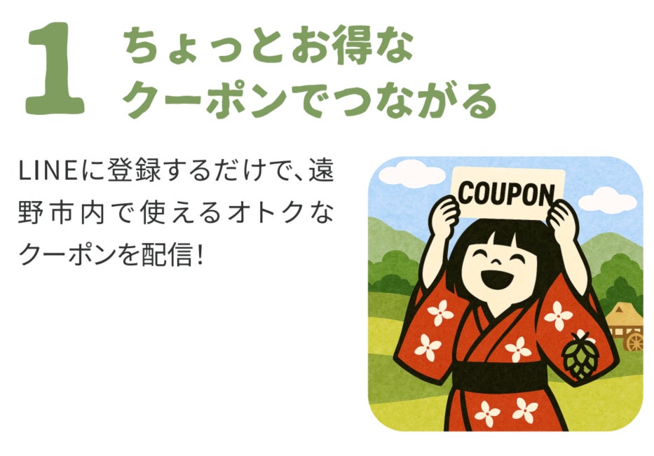 初回の登録特典(2025年8月現在)として、遠野市内の観光施設や地域産品のECサイトで使用できる割引クーポンをご用意しており、今後もスタンプラリーや行催事に連動したコンテンツの提供、アンケートの募集など、地域内外での遠野との関わりしろを増やすことで関係人口の増加に寄与します。
