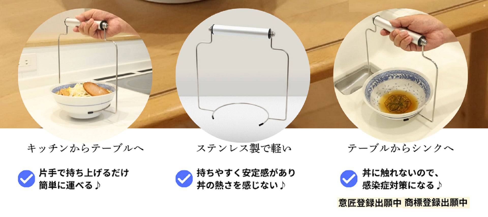 「丼(どんぶり)キャッチャー」は、誰でも簡単に使えるステンレス製のキッチン用品です。通常、ラーメン鉢や丼を運ぶ際は、手で器を持ち、バランスを取りながらお盆に載せ、配膳先で再び手で降ろすという不安定な作業が求められます。器の重さや熱さは、指先への負担がかかり、配膳に慣れていない場合、事故につながることもあります。しかし、「丼キャッチャー」は器をサイドからスライドさせて持ち上げ、配膳先で降ろして横にスライドさせるだけで配膳完了。取っ手を掴むだけで運べるため、誰でも迅速かつ安全に運ぶことができ、人手不足のラーメン業界などの外食産業の手助けができる商品です。