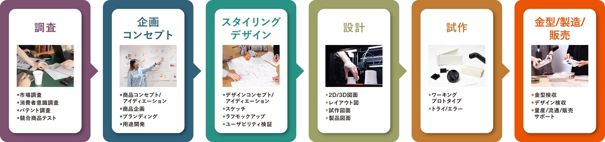 調査、企画・コンセプト、スタイリングデザイン、設計、試作、そして金型・製造・販売まで、すべてのフェーズをカバー可能です。