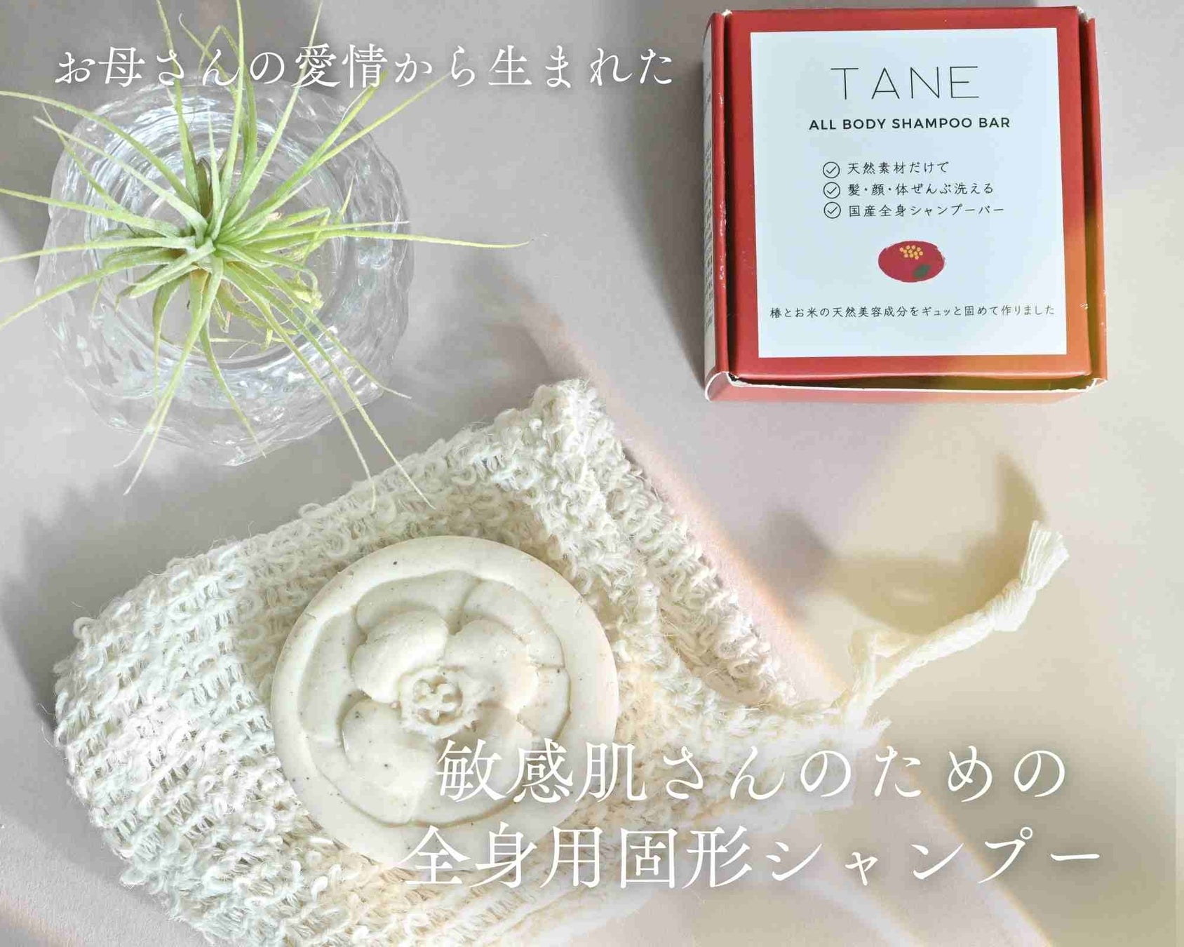 • TANE全身シャンプーバー(たね):アトピーに悩む息子のために開発。東京都利島の椿を種まで丸ごとフル活用。肌と同じ弱酸性で無香料。介護施設でも使用されており、ベビーや敏感肌の方にも最適です。