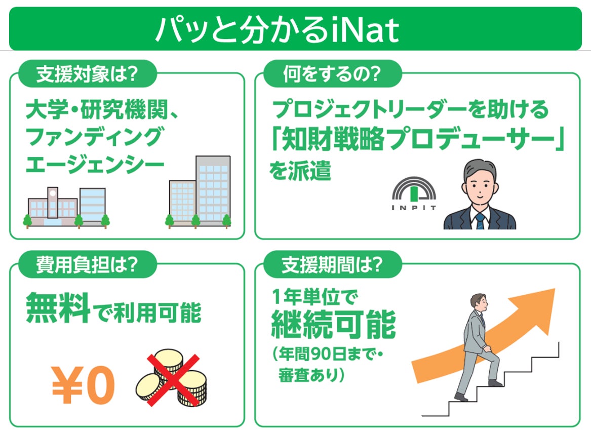 独立行政法人工業所有権情報・研修館(INPIT・インピット)では、国プロ向け知財支援「iNat」の公募を令和6年12月2日から開始しました。採択された場合、令和7年4月から1年間、知財専門家による支援を無料で受けられます。