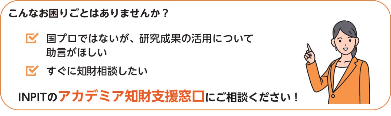INPITでは、iNatの他、アカデミア知財支援窓口にて、常時、国プロに携わる研究者のみなさまの知財に関する相談を受け付けています。