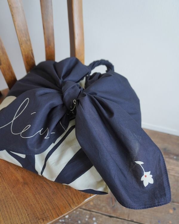 正方形の布一枚だからこその自由度の高さがあり、「包む・結ぶ・広げる」と、暮らしの中で幅広く活用できる。ショッパーとして、購入した商品を包み持ち帰った後は、自由に再利用してもらえる。