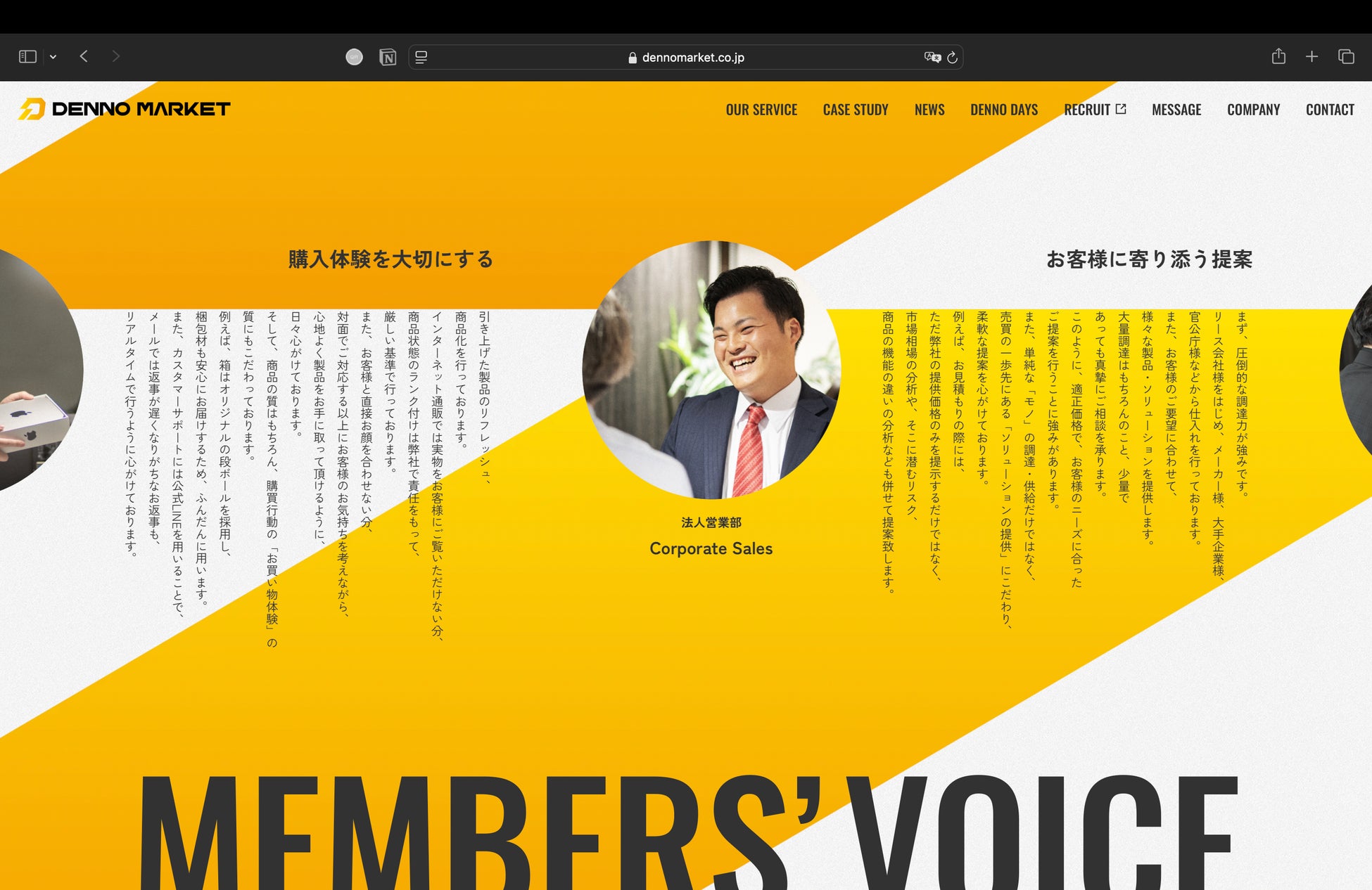 PC版では、少し珍しい横スクロール仕様です。TOP画像には、電脳マーケットオリジナルの外箱が鎮座。そして、その残像は、躍動感ある活発な流通のさまを体現しています。少し横に行くと、VisionとStatement。社会1人1人の挑戦が生む熱量が伝播し、日本社会に革命をもたらし、世界を変えていくのだという確固たる信念と熱量の伝わってくるページです。