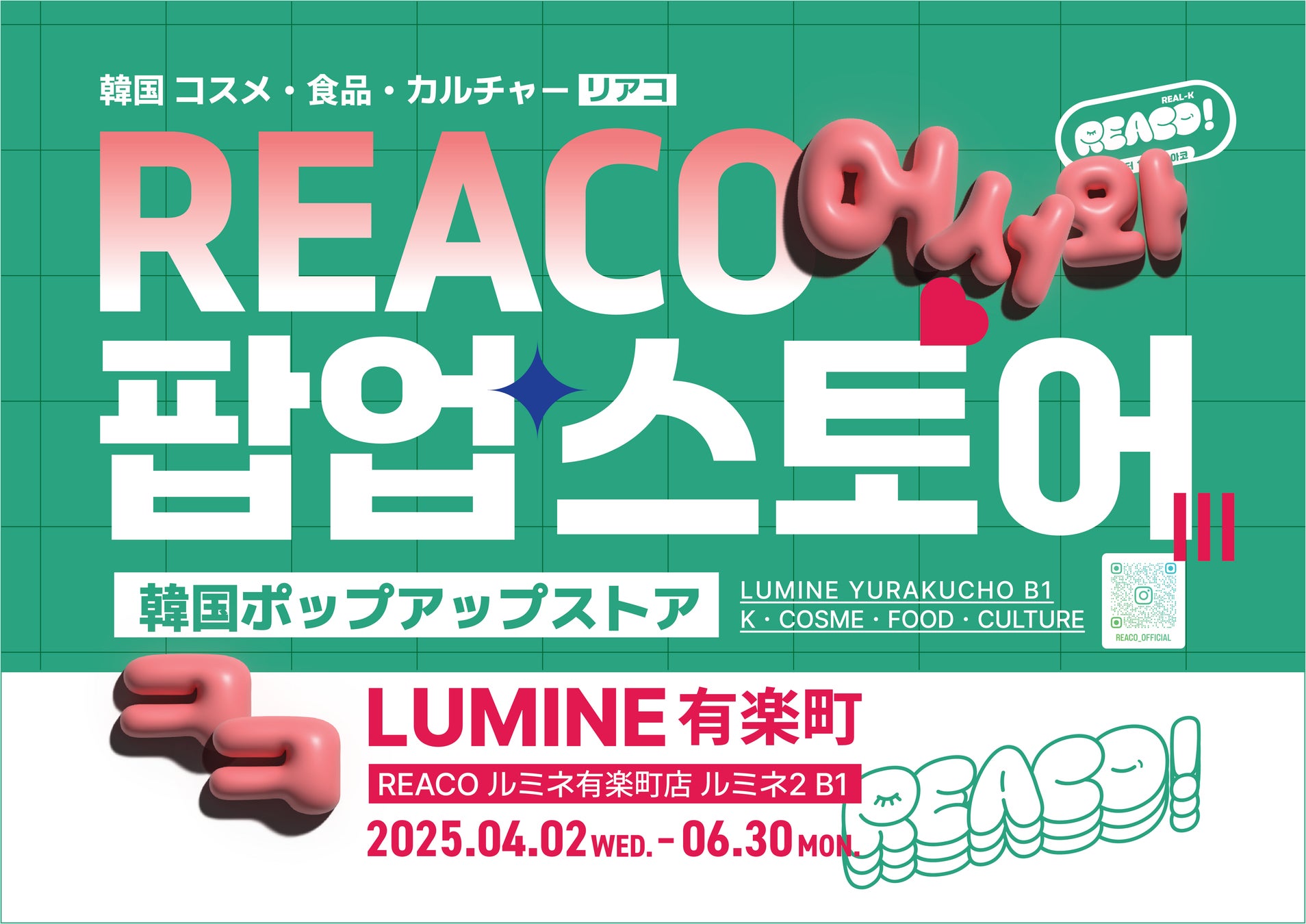 株式会社REACO(代表取締役:山田 将一、本社:神奈川県川崎市)は、2025年4月2日(水)に、韓国コスメ&食品専門店「REACO(リアコ)」のポップアップストアをルミネ有楽町 ルミネ2/B1(株式会社ルミネ運営)にオープンいたします。
