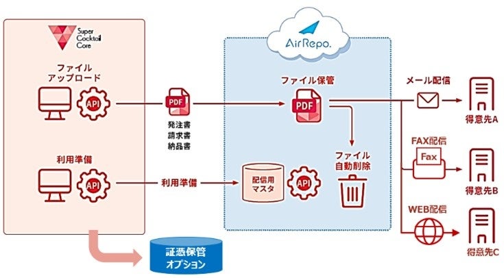 郵便料金の値上げに対し、取引先に帳票をデジタル配信する、内田洋行の文書自動配信サービス「エアレポ(AirRepo)」を標準機能に搭載しました。スーパーカクテルCoreとAPI連携し、帳票を簡単に配信できるほか、配信した帳票は電子帳簿保存法にも対応し、内田洋行の「証憑保管オプション」に自動保管、大幅な業務効率化を実現します。