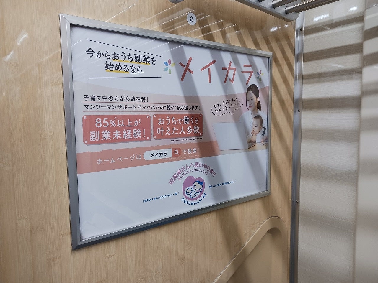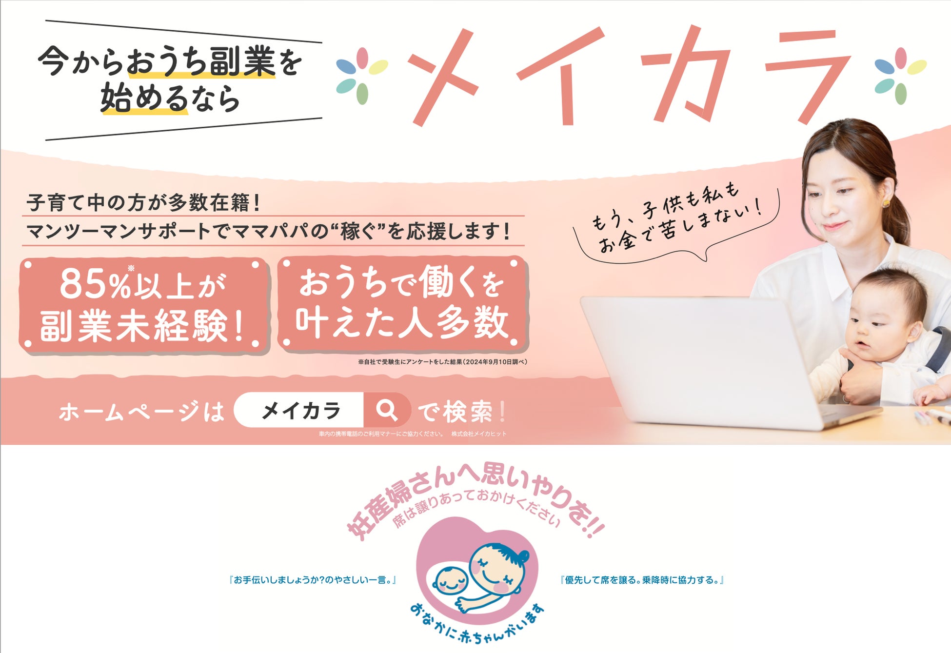 株式会社メイカヒットが運営する在宅ワークスキルを習得したい方を支援するWebスクール「メイカラ」は、厚生労働省が推進するマタニティマークとのタイアップ広告を都営浅草線と大江戸線に掲出しました。