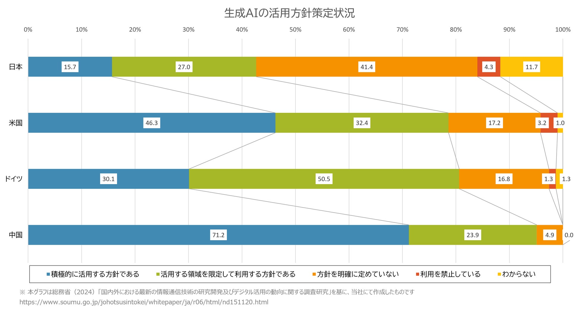 しかし、未だ国内企業における生成AI利用率は50%以下と他国と比較して低調である一方、利用検討は90%近くに上っています。