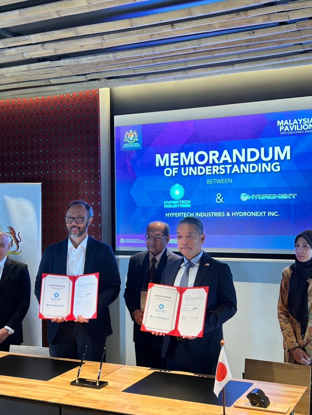 今回のMOU締結式は、Expo2025 大阪・関西万博 マレーシアパビリオン内での式典にて、マレーシア科学技術イノベーション省(MOSTI)の事務局長 Datuk Seri Hj. Hasnol Zam Zam bin Hj. Ahmad 氏立ち会いの下、株式会社ハイドロネクスト CEO 永井正章と、NanoMalaysia Berhad(NMB)CEO 兼 Hypertech Industries Sdn Bhd(HISB)取締役 Dr. Rezal Khairi Ahmad氏との間で執り行われ、マレーシア現地のメディアにも取り上げられました。