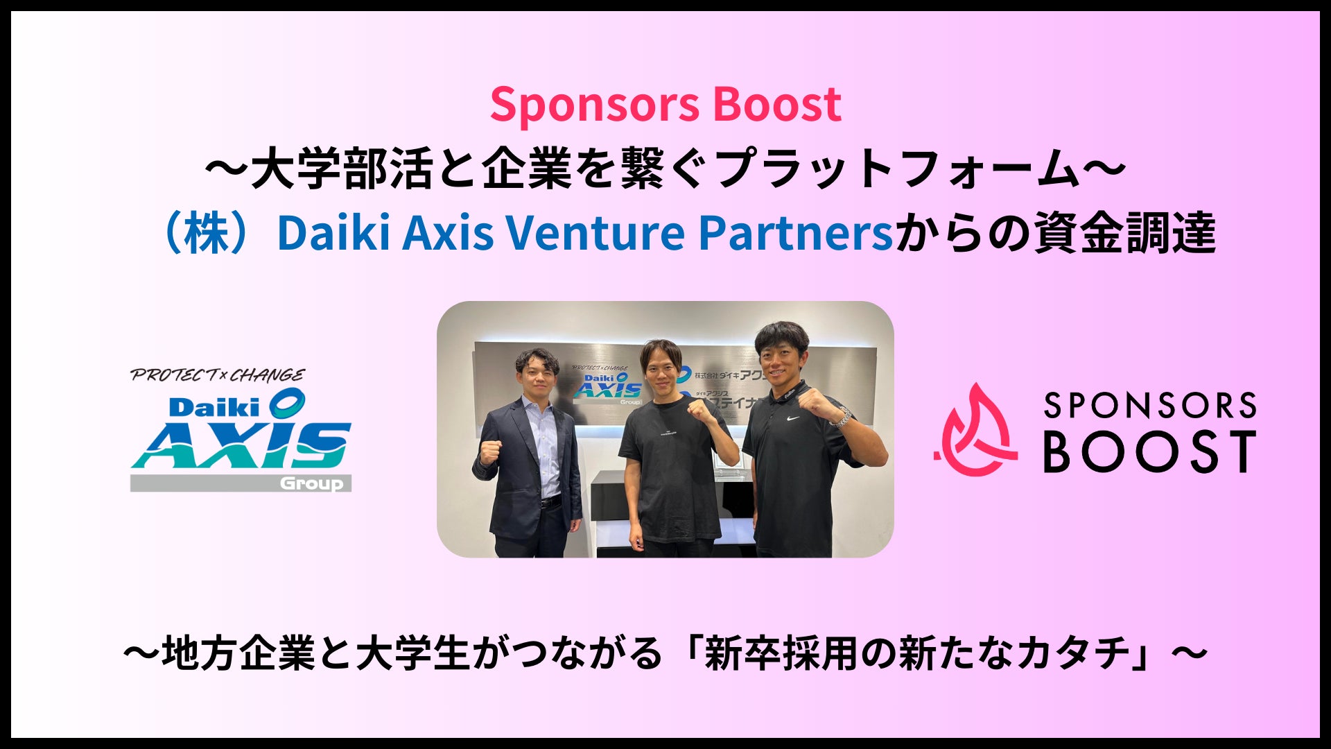 企業が大学の部活に対して、小口でスポンサー出資をできるプラットフォーム「SPONSORS BOOST」を開発・運営する株式会社スポンサーズブースト(本社:大阪市西区、代表取締役:西里 将志、以下当社)は、株式会社ダイキアクシス(本社:愛媛県松山市、代表取締役社長:大亀 裕貴)の子会社である株式会社 Daiki Axis Venture Partners(本社:東京都中央区、代表取締役 大亀 裕)が運営するファンド(DAVPベンチャー1号投資事業有限責任組合)より出資を受けました。