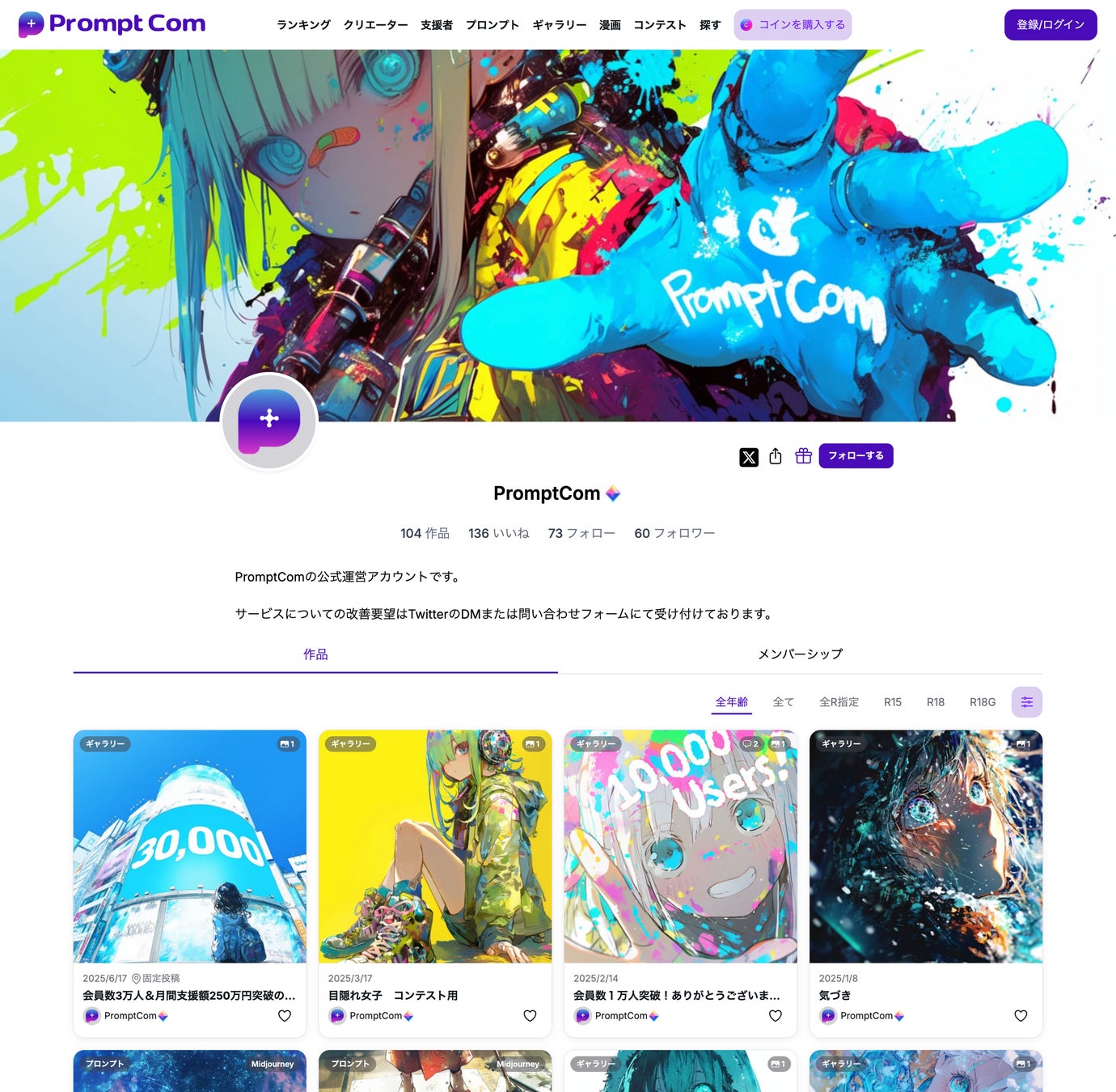 PromptComは、AI技術を活用して制作されたイラスト・漫画・プロンプトなどの作品を投稿し、収益化・ファンとの交流・SNS的な発信がすべて一体となった、AIクリエイターのためのオールインワンプラットフォームです。