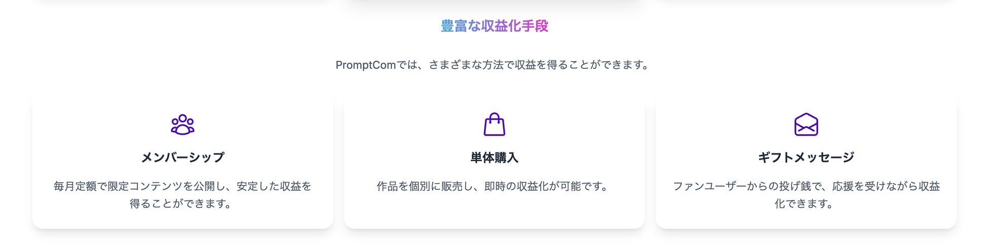PromptComでは、以下のような多彩な収益スタイルを“すべて併用”することができます。創作活動の幅やファンとの関係性に合わせて、自由に活用できるのが特徴です。