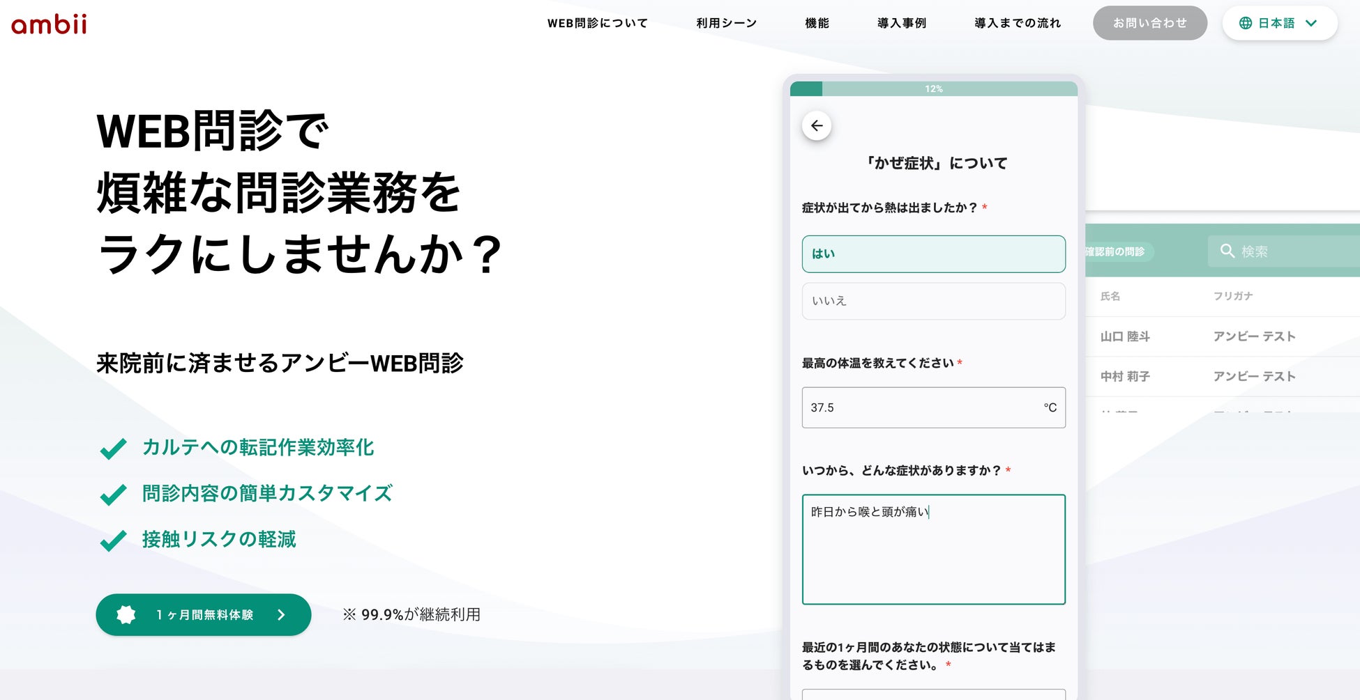 Ambiiは、筑波大学発のスタートアップ企業で、クリニックや病院向けに多言語対応のWEB問診システムを提供しています。
