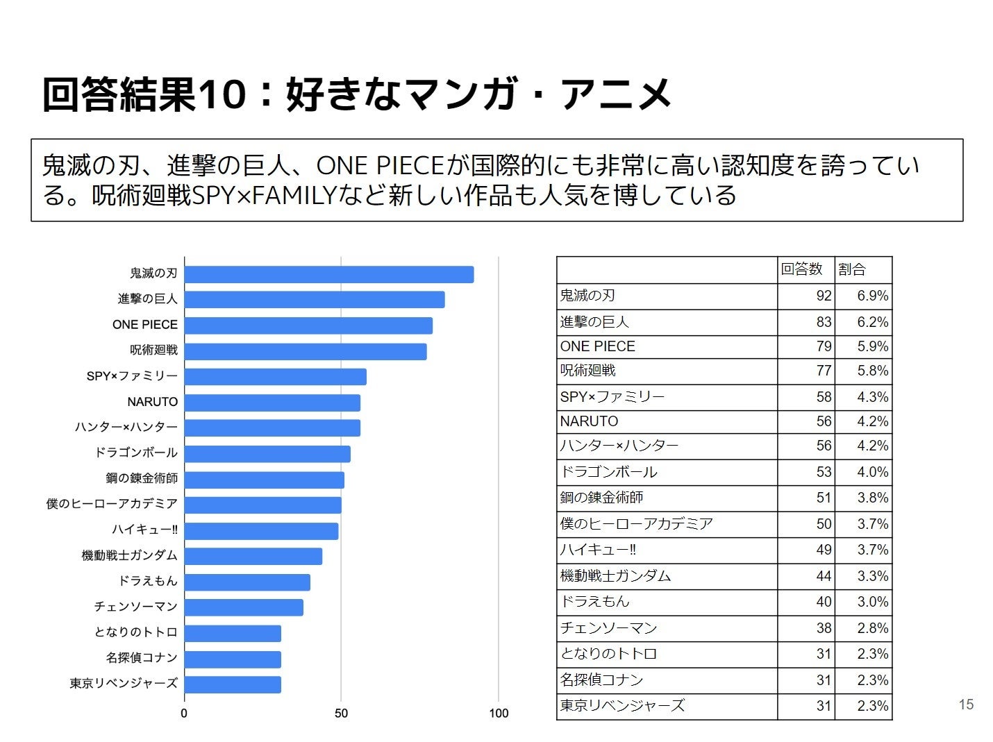 調査の結果、訪日観光客の中では、『鬼滅の刃』、『進撃の巨人』、『ONE PIECE』などが非常に高い認知度を誇り、『呪術廻戦』『SPY×FAMILY』など新しい作品も人気を博していることがわかりました。