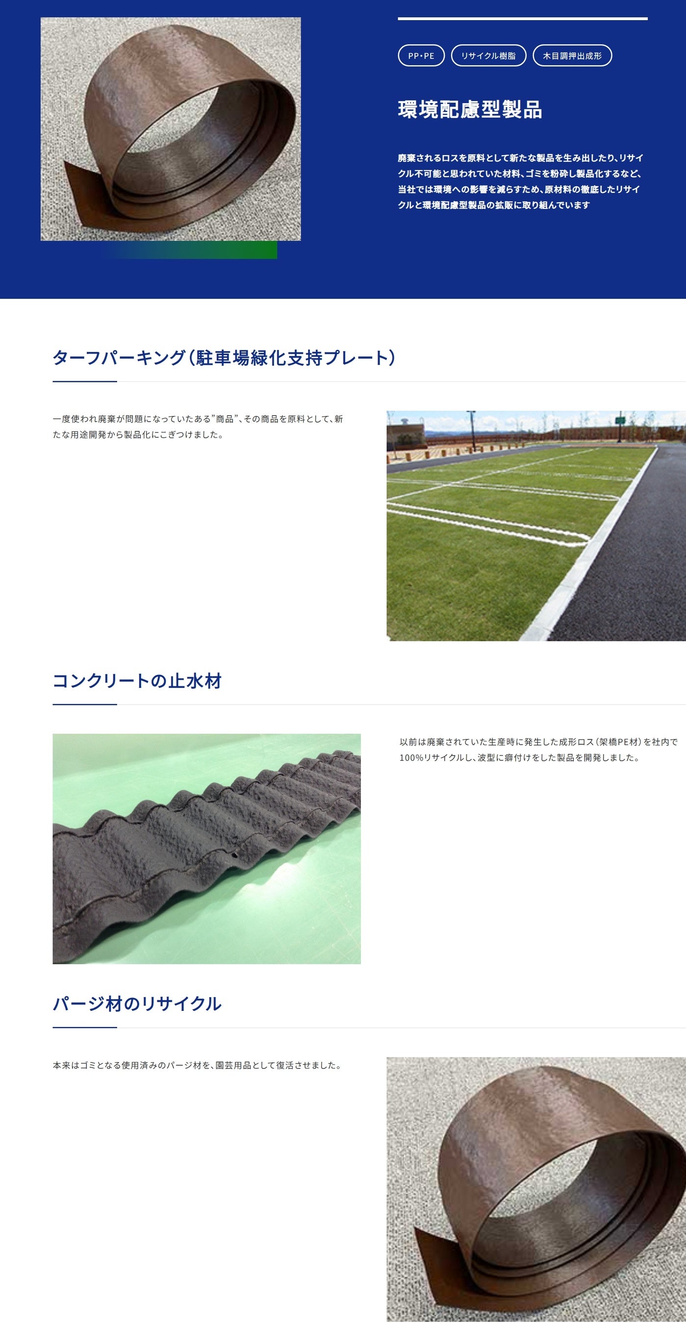 カツロンでは、廃材を使用した木粉を配合した製品や、世界初*の立体押出成形技術を活用した「ターフパーキング」などエコロジー製品の拡販に取り組んでおります。