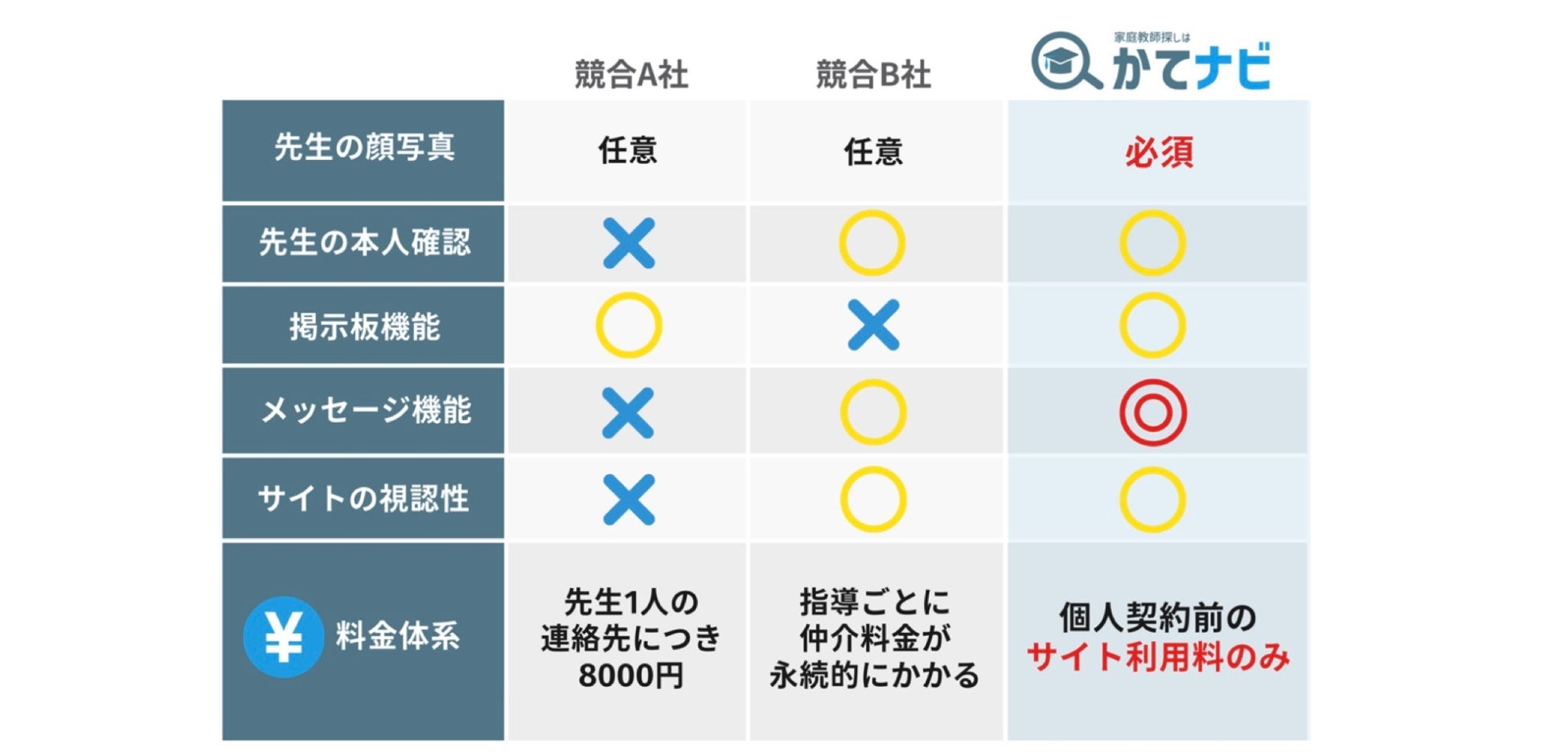 A社では、ご家庭が先生1人の連絡先をお求めになるたびに8000円かかるため、複数人の先生を見てご検討されたいご家庭の場合、人数に応じて費用が嵩みます。B社では、指導ごとに仲介料金が永続的にかかるため、指導回数に応じて費用が嵩みます。