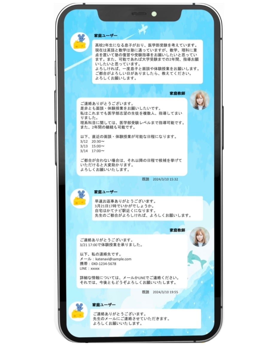 ご家庭ユーザーはサブスク会員登録後、サイトに在籍するすべての先生ユーザーとやり取りできます。掲示板へ応募があった先生に返信することはもちろん、その他の先生に対して直接スカウトを送ることも可能です。メッセージの人数や件数、内容に一切の制限はなく、メールやLINEなどの連絡先の交換も自由に行えます。体験授業を実施し、生徒と先生の相性を把握した上で個人契約を検討する、というのが基本的な流れとなります。メッセージの未読・既読表示に加え、先生の最終ログイン日も表示されるため、安心してご利用いただけます。