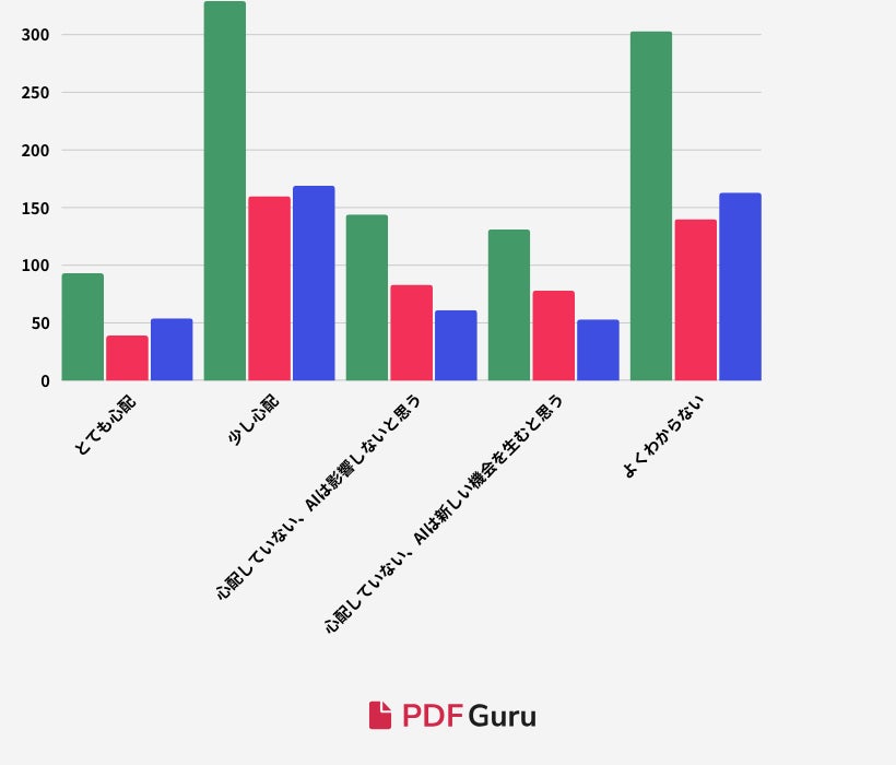 全体では42.2%がAIが仕事や就職の見通しに与える影響について懸念しており、そのうち9.3%がとても心配し、32.9%が少し心配している一方、27.5%は影響がないと考えており、30.3%がよくわからないと答えていることが示されています。これにより、かなりの割合が懸念を示す一方で、約41.5%はネガティブな影響を感じず、むしろ新たな機会が生まれる可能性があると捉えていることがうかがえます。