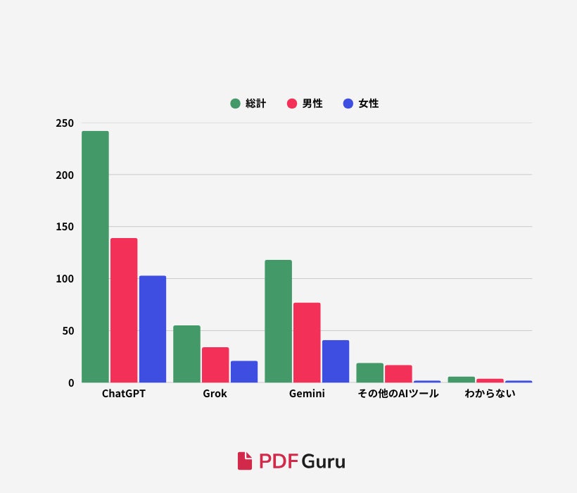 全体の約72%がChatGPTを使用し、約35%がGemini、約16%がGrokを利用している一方で、その他のAIツールは約6%にとどまっています。これらの割合は、他のツールに比べてChatGPTの利用が際立っていることを示しています。