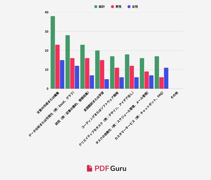 最も多く選ばれたAIの活用方法は「文章の作成または編集」(約72%)で、次に多かったのが「データ分析または可視化」(53%)と「研究」(43%)でした。一方で、言語翻訳、コーディングまたはソフトウェア開発、クリエイティブなタスク、タスクの自動化、カスタマーサービスはそれぞれ約30%ほどでした。これにより、AIが幅広い業務や学業で活用されており、特に文章やコンテンツ関連のタスクが中心になっていることが分かります。例えば、PDF GuruのAI PDFサマライザーのようなツールは、AIを活用してPDFファイルを効率的に要約するのに役立ち、コンテンツ管理における技術の有用性を示しています。