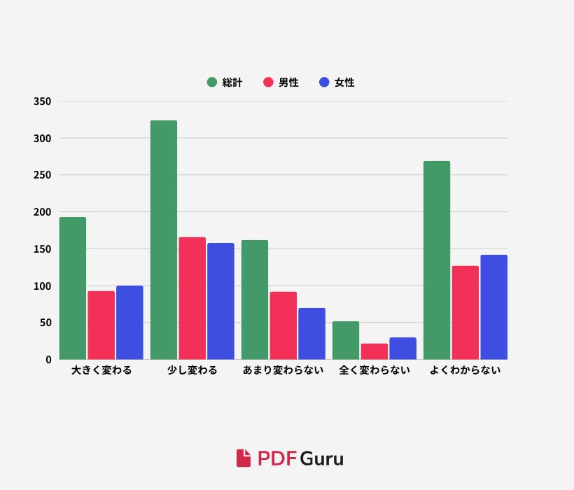 回答から、全体の約51.7%が「AIが今後5年間で日本での仕事や勉強のあり方を変える」と考えており、19.3%が「大きく変わる」、32.4%が「少し変わる」と答えています。一方、約21.4%は「あまり変わらない」、または「全く変わらない」とし、26.9%はよくわからないと答えています。