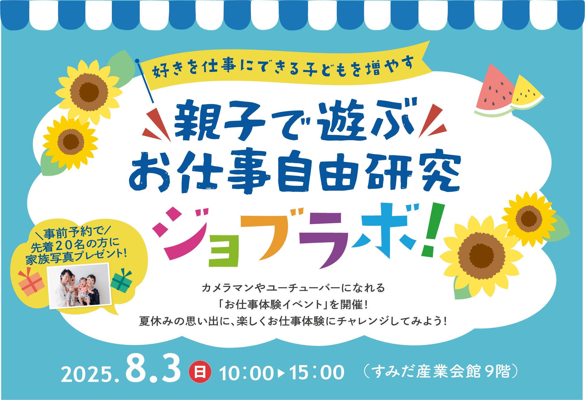 働き方が多様化するいま、子どもたちが「自分の好きなことを仕事にする力」を育むための体験型イベント【ジョブラボ!】を墨田区にて開催します。親子で参加できるワークショップやお仕事体験を通して、仕事=楽しい・選べるという前向きなキャリア観を育てることを目的としています。リアルな「働く」を自由研究のように学べる一日です。